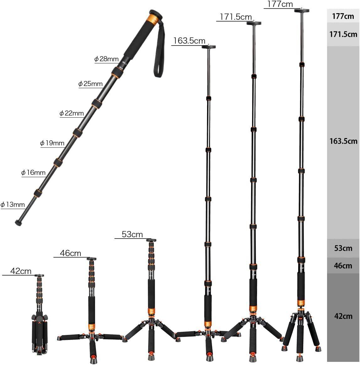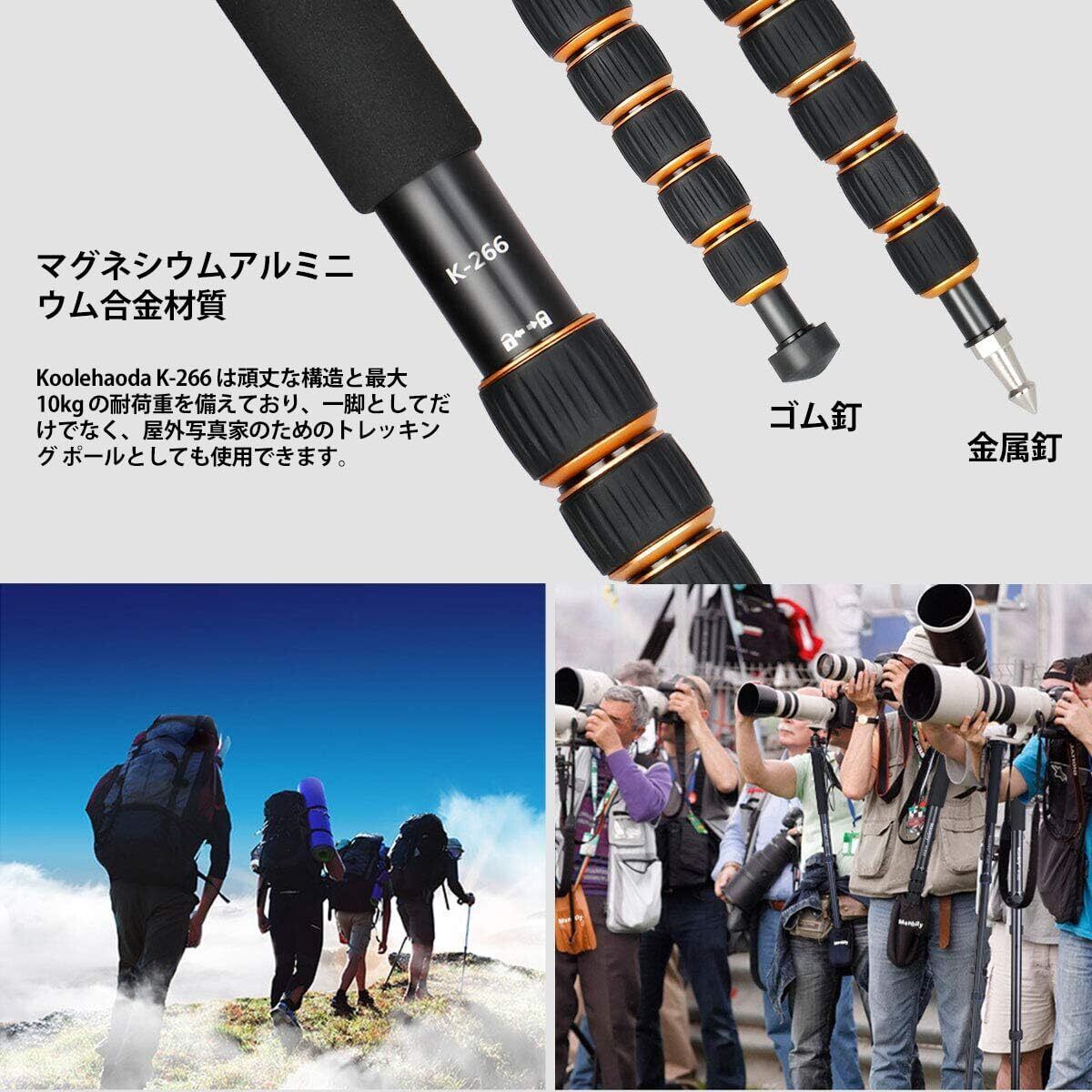 一脚と三脚は、一脚を安定させるのに十分な強度と耐久性を備えた高品質のアルミニウム合金で作られています。耐荷重:6kg;