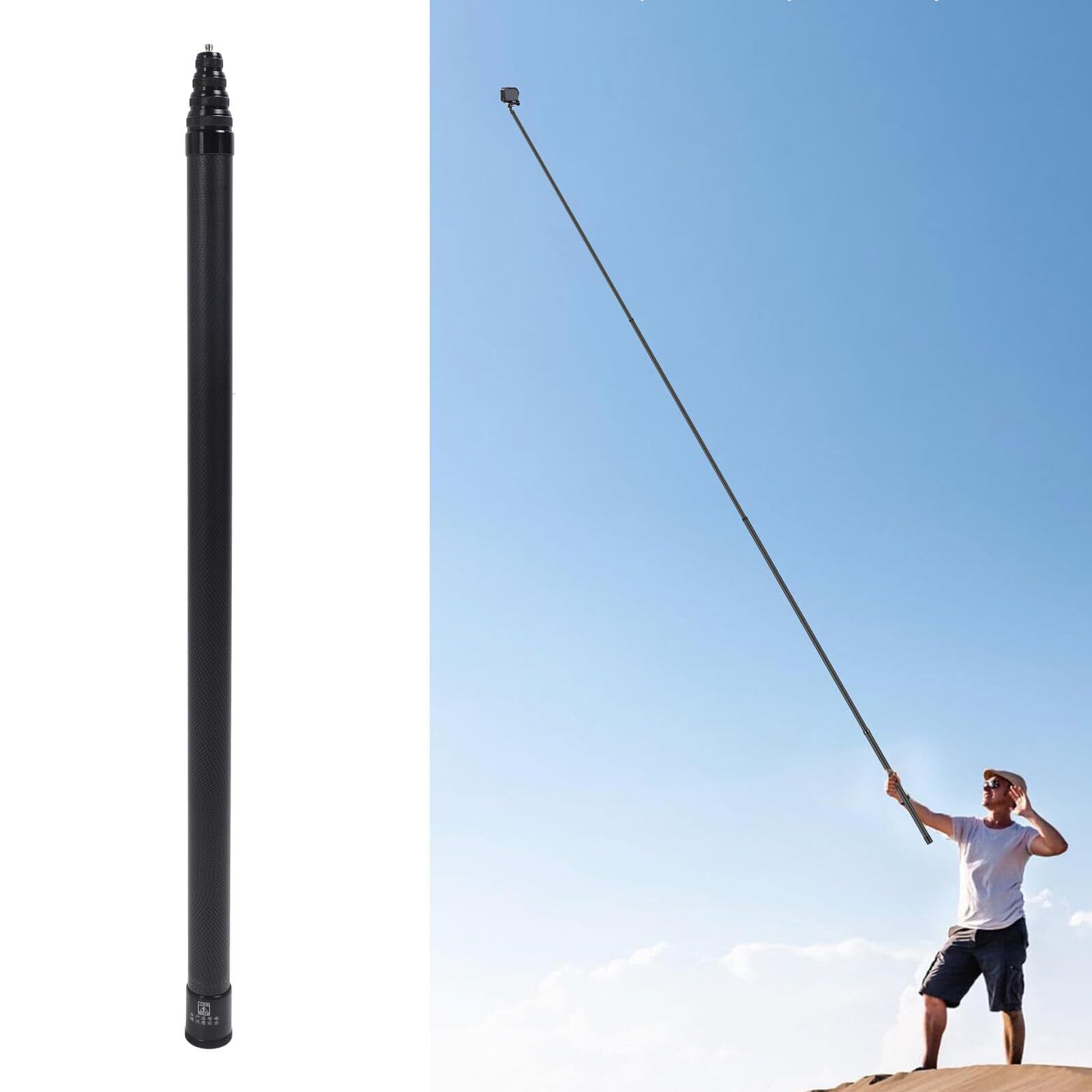 2。任意の長さで拡張可能:69〜500cmの長さの範囲で、この9セクションのカーボンファイバー拡張ポールは、多様な視点と角度をキャプチャするための柔軟性を提供します。 2ウェイインターフェイス:電話クリップ、アクションカメラ、写真ライト、三脚、吸引カップ、またはモノポッドを接続するための下部1/4インチのネジ穴のための上部1/4インチネジ。機器の取り付けの柔軟性と安定性を提供します。炭素繊維材料:強度と靭性を組み合わせた8層の炭素繊維で作られたセルフィーポールは、頑丈で錆びません。 30mmの最大チューブ直径は、耐久性と軽量設計を促進します。