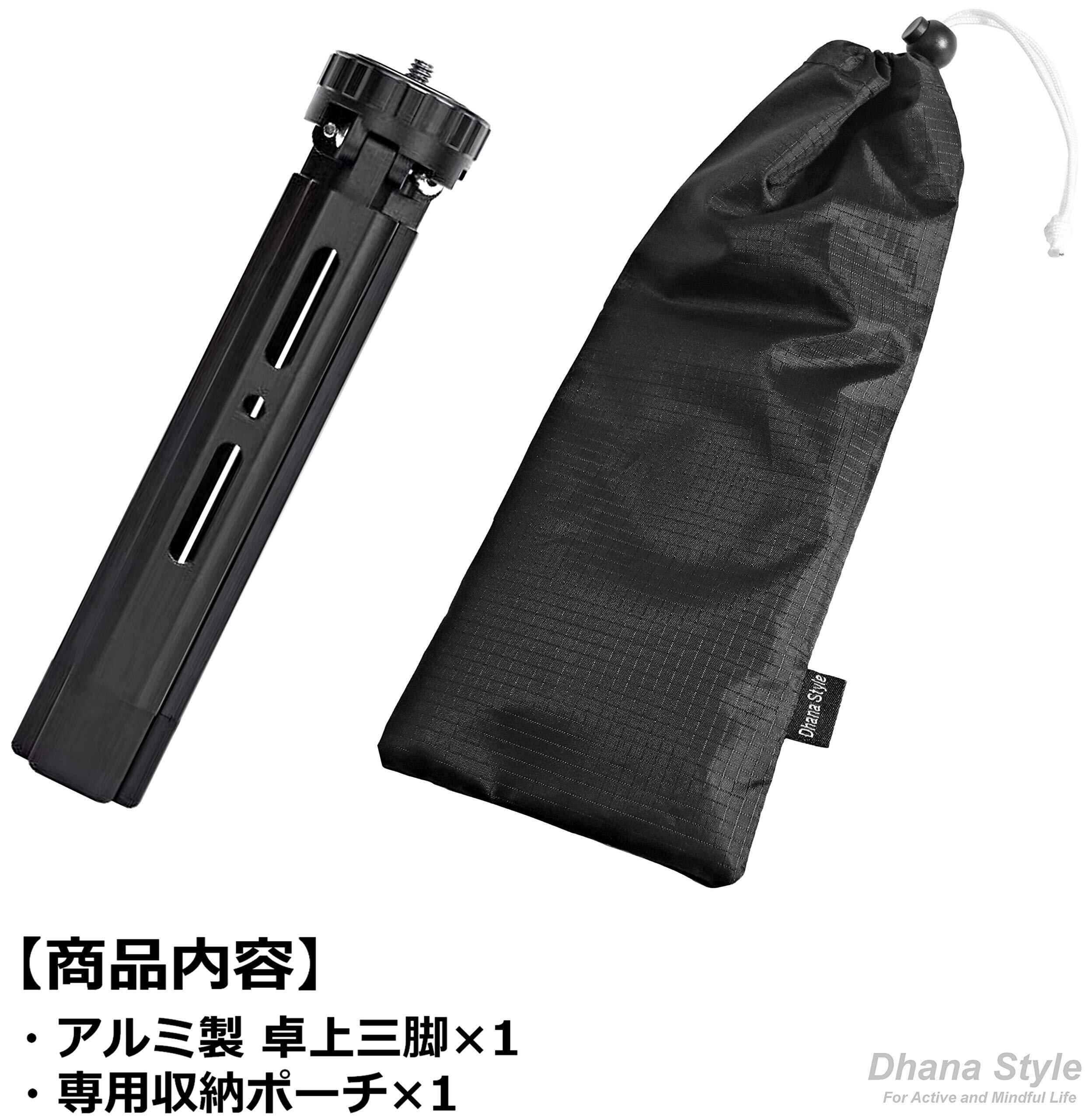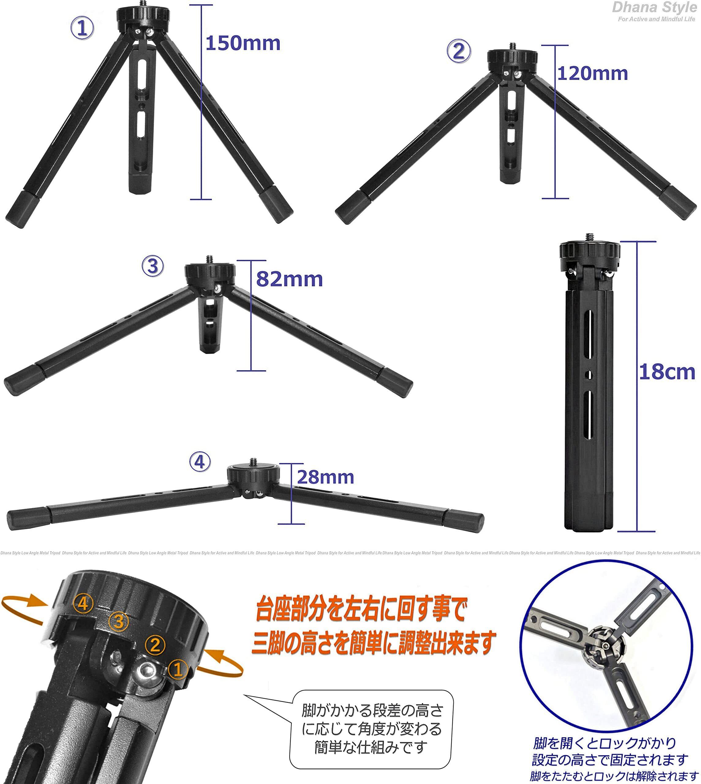 【三脚仕様】ネジサイズ;汎用性のある1/4インチ、 長さ:18㎝ (折り畳んだ状態) 、三脚用途使用時の地上高(4段階高さ調整可能);①28㎜ ②82㎜③120㎜④150㎜ (台座部分を回す事で三脚の高さを簡単に調整・固定可能;脚がかかる段差の高さに応じて角度が変わります、脚を開くとギャップに嵌って固定される単純な仕組みで安定性が高く大変便利な構造です) 台座直径:39mm, 重量:約200g, 耐荷重:3.5㎏, カラー;ベーシック ブラック (黒・無地), 主な材質:強化アルミ合金(台座部:ラバー) 各脚には1/4インチ スレッド加工 (メス) がされており撮影アクセサリーやメインの台座以外にも撮影機器を取り付けが可能です。各脚の先端は良質なラバーグリップを採用、滑り止め作用により安定性を確保、設置対象箇所の傷つき防止作用もあります。 ※三脚に水準器 (レベラー) は搭載しておりません ※タコ足 三脚 (ゴリラポッド・フレキシブル三脚) のように クネクネ として斜面設置、棒やポール に巻き付けての撮影は出来ません。三脚設置は水平面のみ可能です。