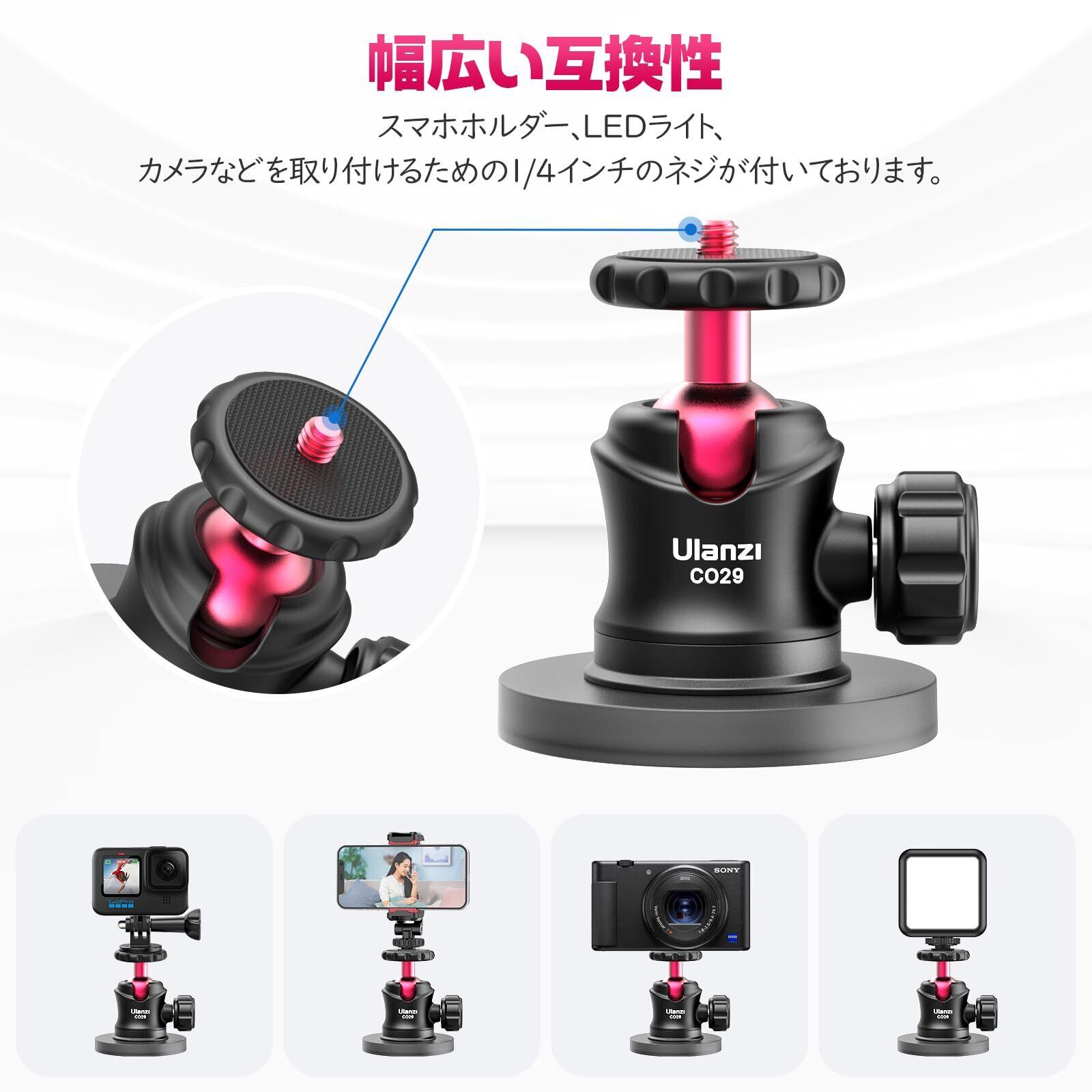 Ulanzi 自由雲台 カメラ磁気スタンドセット ボールベッド雲台 360°回転可能 超強力磁力 垂直耐荷重20kg 66MMマグネット台座 GoPro用 アクセサリー アルミ合金製 1/4インチネジ カメラマウト Gopro Hero 11 10 9 8 7 /Insta360 /アクションカメラ/ビデオ カメラ/三脚/一眼レフ/DSLRに対応
