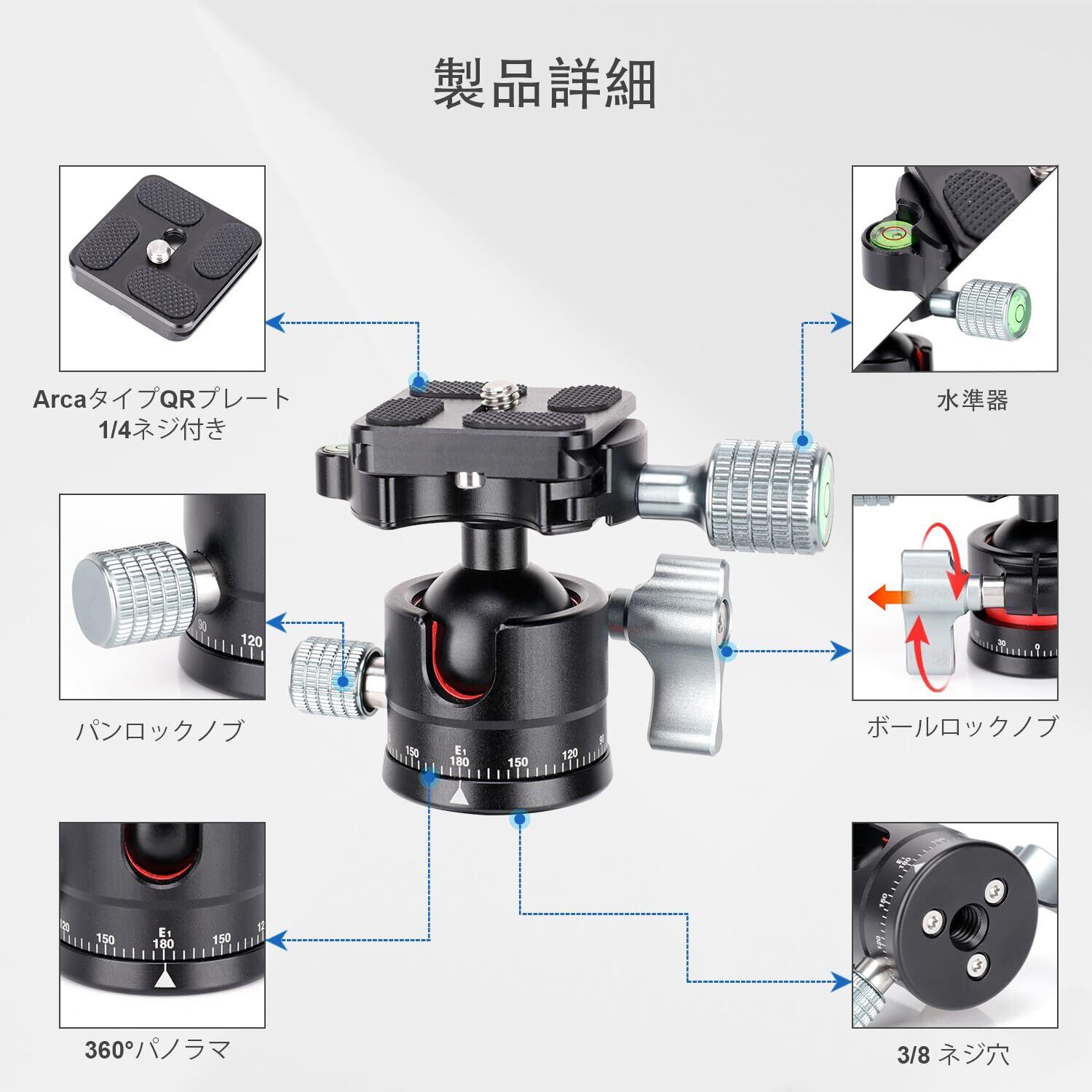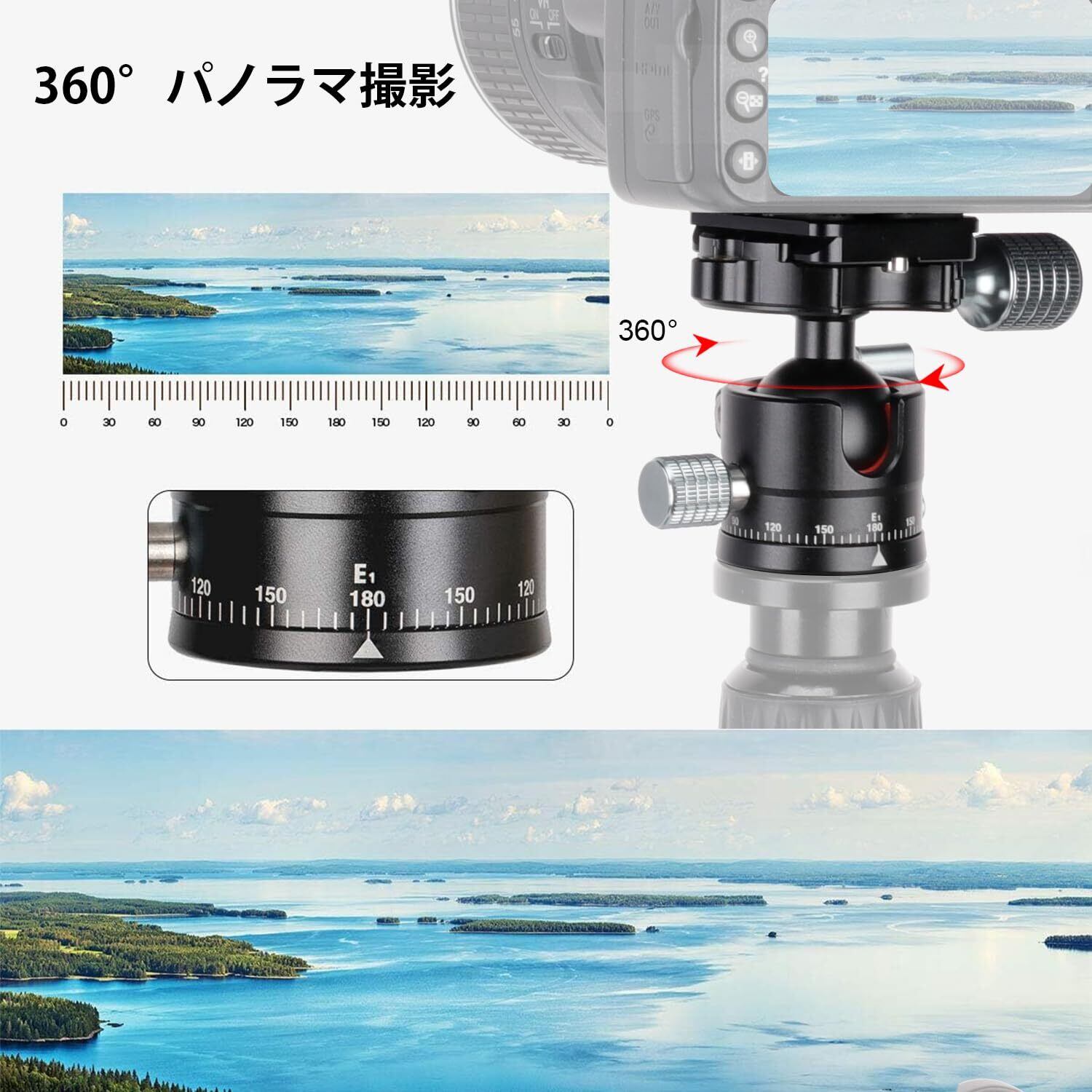 【360度回転パノラマ撮影可能】ロックロータリノブでさまざまなニーズを満たすために、ボールとU字型の溝の設計により、360度水平と90度垂直の角度撮影を簡単に切り替えられます。