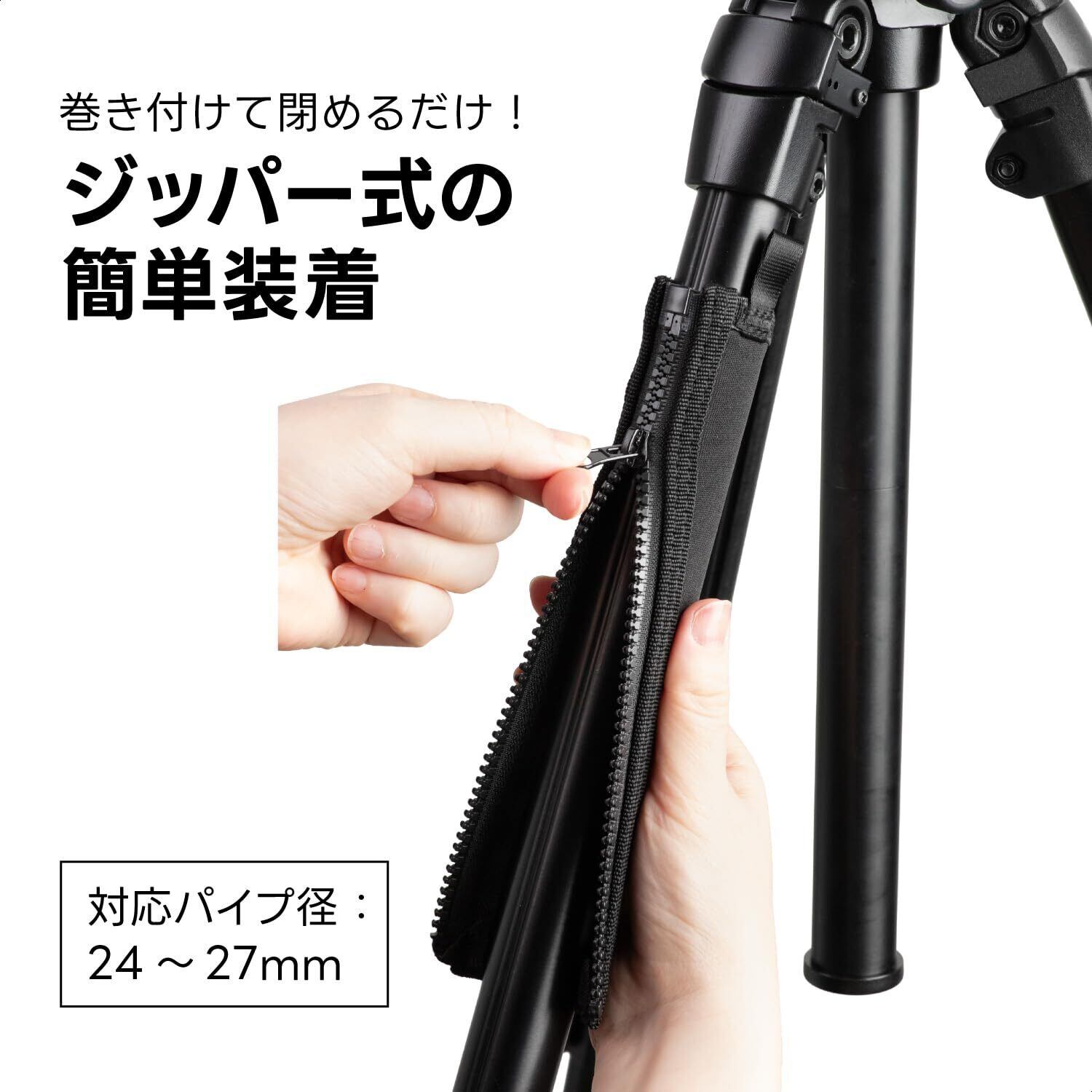 【中型三脚に最適なサイズ】 パイプ径24mm〜27mmの三脚に対応します。長さは215mmで、持ち運び時に握るグリップ部分をしっかりとカバーします。