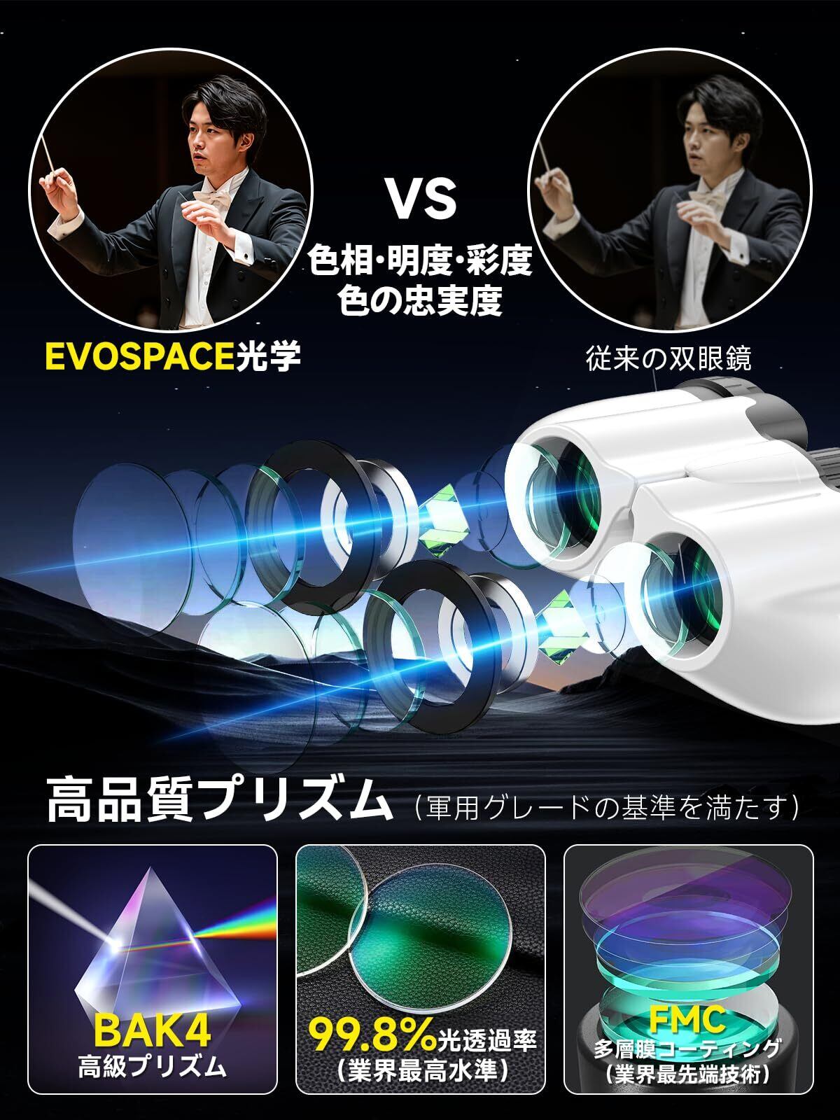 ✨【BAK4プリズム&FMCマルチコート】 最新モデルは、業界トップクラスのBAK4光学レンズとFMCマルチコーティングを採用し、99.8%という驚異的な光透過率を実現。従来のBK7プリズムと比較して、反射や散乱光を最大限に抑え、光の損失を極限まで低減。その結果、コントラスト比が150%向上しました。薄暗いライブ会場や夕暮れ時のバードウォッチングでも、自然で鮮やかな色彩を再現します。プロ仕様の光学設計により、高精細な画質と優れた視認性を両立。長時間の使用でも目が疲れにくいのも特徴です。