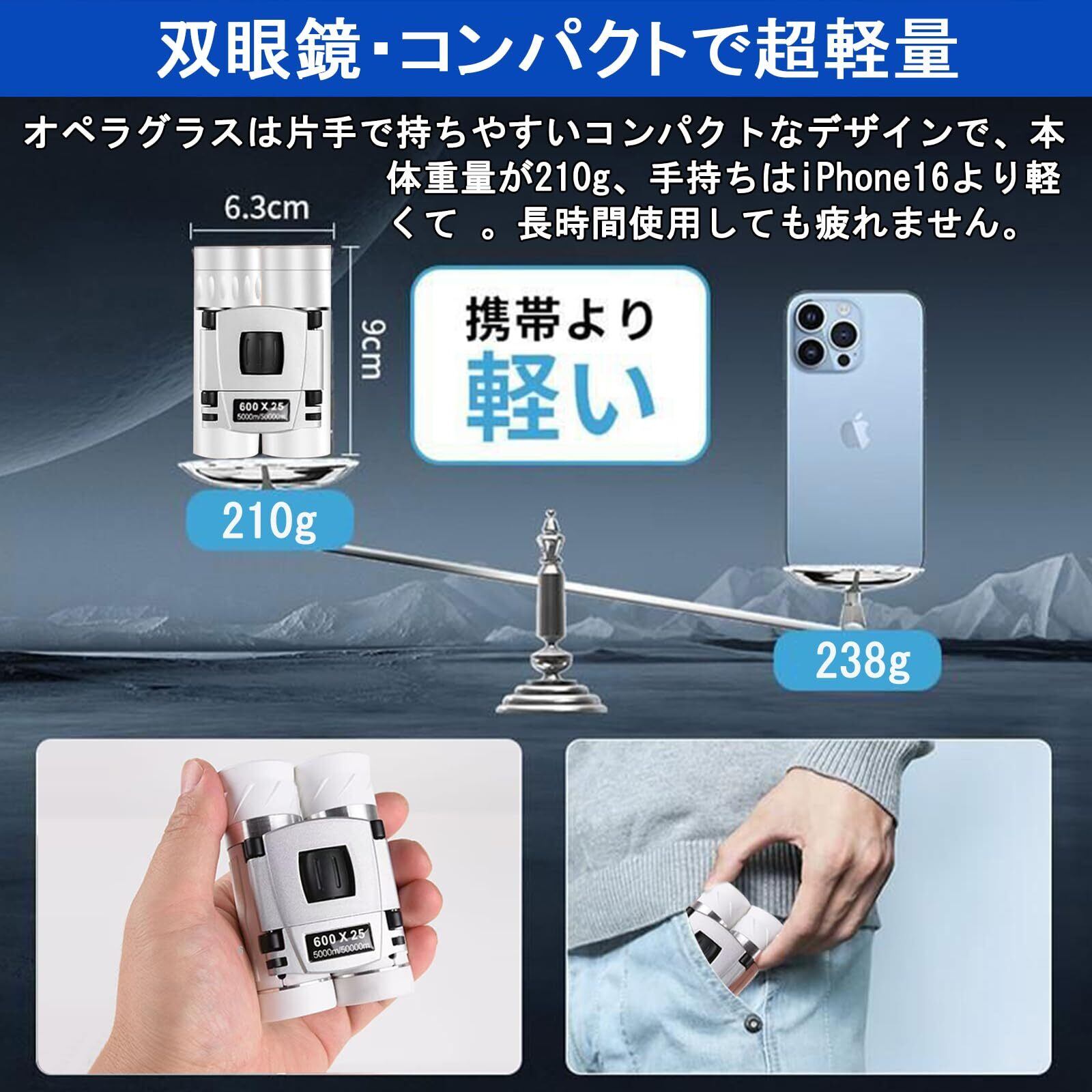 【双眼鏡 ライブ用 ドーム・コンパクトで超軽量】オペラグラスは片手で持ちやすいコンパクトなデザインで、本体重量が約200g、手持ちはiPhone16より軽くて 。滑り止め素材と人間工学に基づいたデザインにより、最大限の労力を節約できます。折りたたむと手のひらサイズになり、女性やお子さんも長時間持っても疲れない。コンパクトでカバンや首掛けて持ち歩いても邪魔になりません。いつでも取り出すと、すぐに観察できます。スタイリッシュで洗練された外観で、バッグの中に入れたり、首や手にかけたりすることができ、持ち運びに便利である。