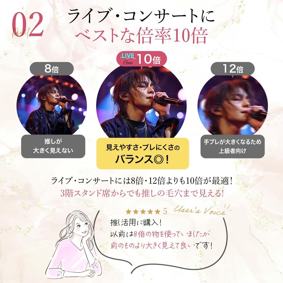 倍率の選び方が簡単!観劇に最適な10倍ズーム設計 8倍や9倍では物足りない、12倍では手ブレが気になる方におすすめの10倍高倍率設計。