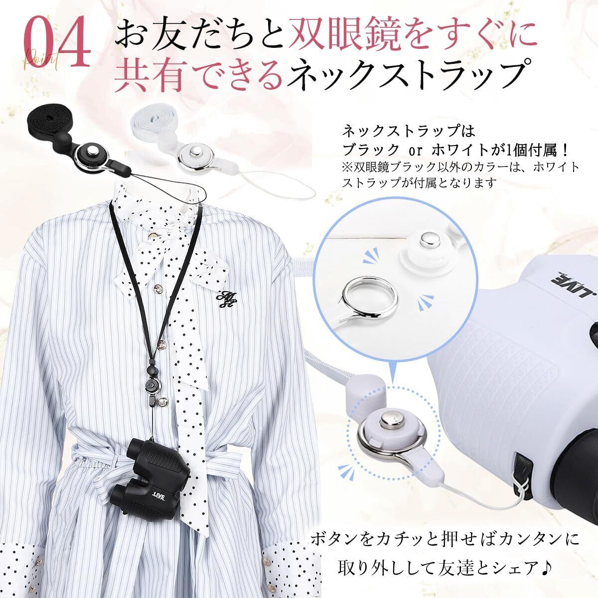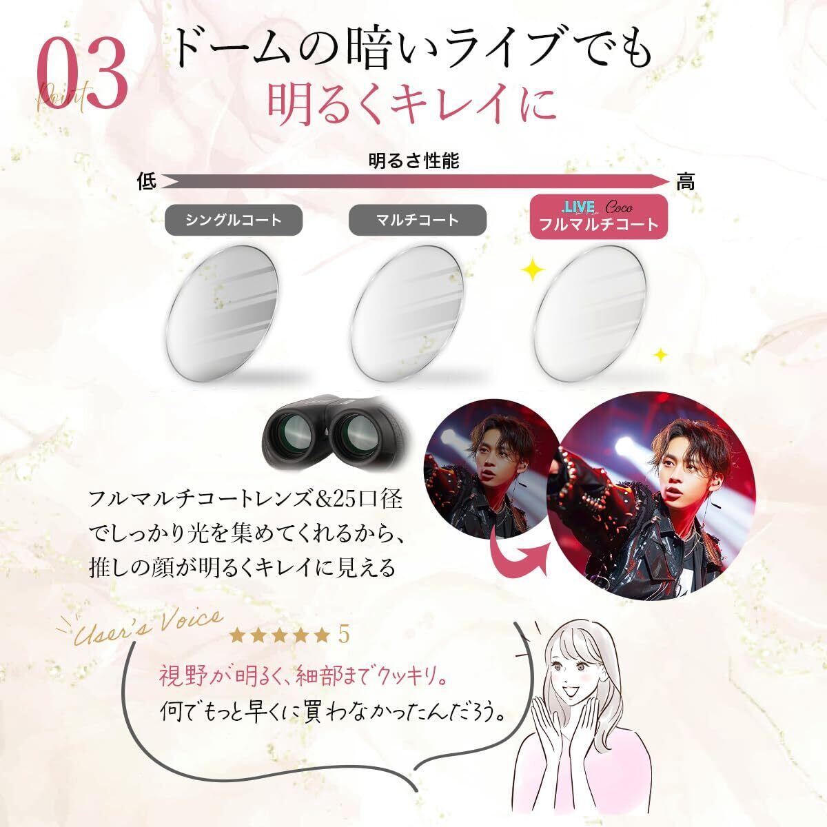 暗所でも明るい高性能レンズ採用 25口径レンズとフルマルチコート加工で劇場やドーム会場でも明るく鮮明な視界を実現。生活防水仕様なので1個あるとアウトドア・スポーツ観戦にも使えちゃう!