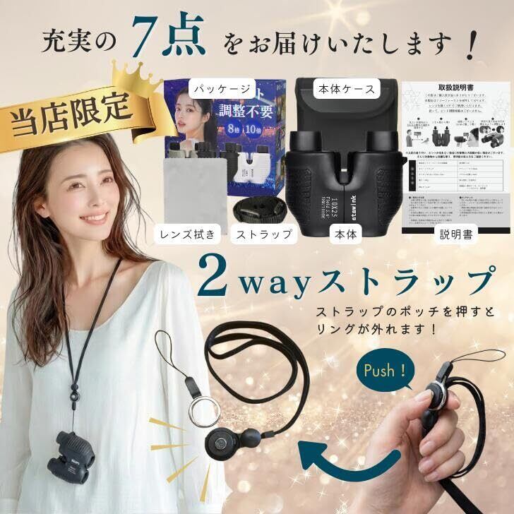 【生活防水×軽量設計|アウトドアにも対応】 急な雨にも安心の生活防水仕様。 野外フェス・野球観戦・サッカー観戦・キャンプ・バードウォッチングなどにも最適。 軽量コンパクト設計で長時間使用でも疲れにくい。 【仕様】 ・倍率:10倍 ・口径:25mm ・ピント調整:フリーフォーカス ・カラー:ブラック ・付属品:専用ケース/ネックストラップ/レンズクロス/日本語説明書
