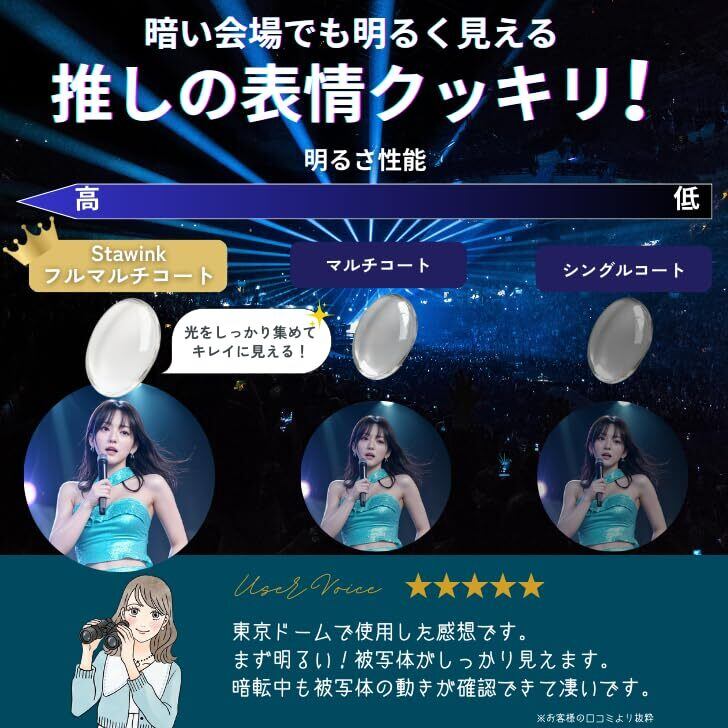 【フルマルチコートレンズ採用|明るく自然な視界】 反射を抑えるフルマルチコートレンズを採用。 暗いライブ会場や屋内ホールでも明るく自然な見え方を実現。 メガネ対応設計で、 メガネをかけたままでも快適にご使用いただけます。