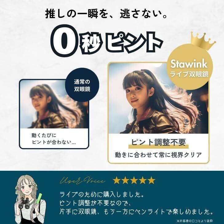 【ライブ・コンサート専用設計|瞬間を見逃さない】 ピント合わせ不要だから、 推しが動いてもすぐ見える。 コンサート・ライブ・ドーム公演・アリーナ・舞台・観劇・ミュージカルなど 激しい動きのあるシーンでも自動でピントが合い続けます。 ・ 推し活 ・K-POPライブ ・ジャニーズ・アイドル公演 ・フェス・スポーツ観戦 大切な瞬間に集中できます。
