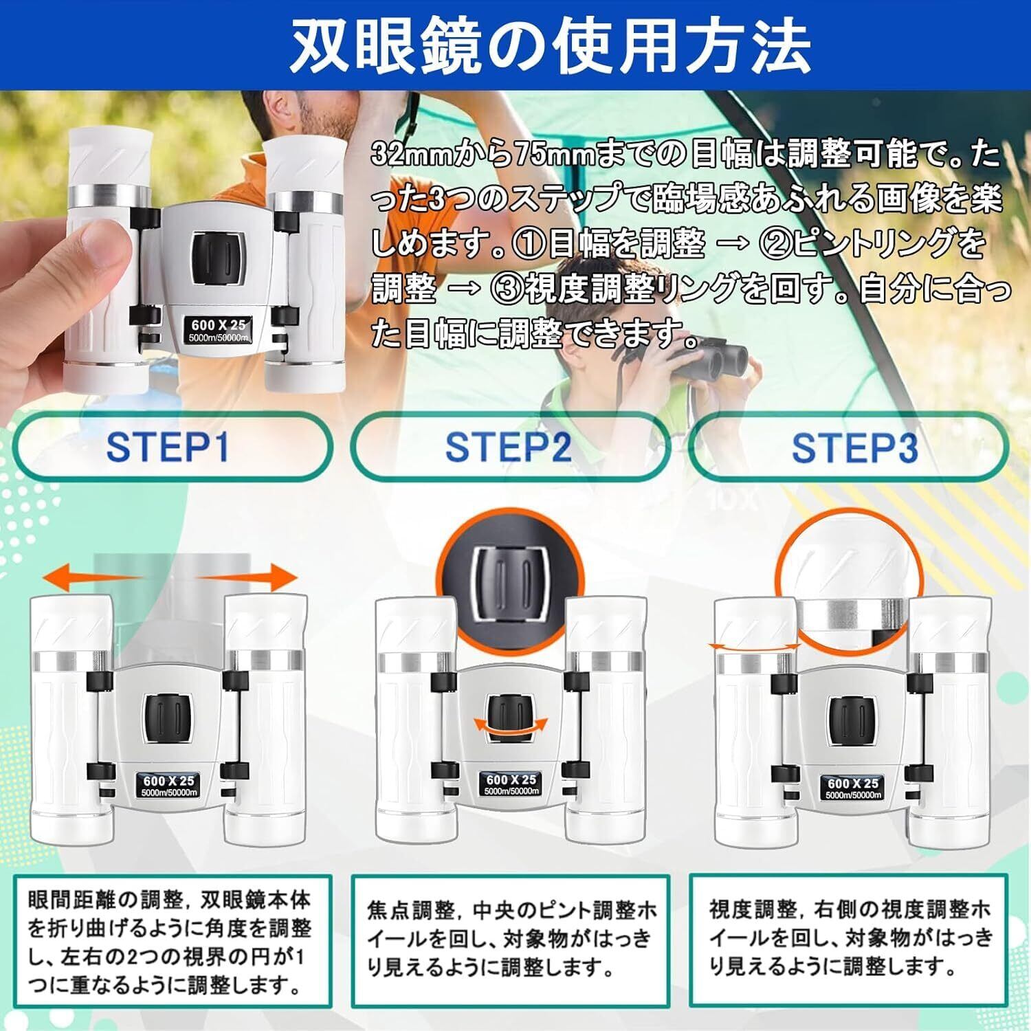 生活防水&使用方法:この製品はIPX5の生活防水レベルに達することができます。雪や雨が本体に降っても、乾いたきれいなポリエステルまたは両面フランネルで拭き取るだけで、その後の使用に影響しません。32mmから75mmまでの目幅は調整可能で。たった3つのステップで臨場感あふれる画像を楽しめます。①目幅を調整 → ②ピントリングを調整 → ③視度調整リングを回す。自分に合った目幅に調整できます。