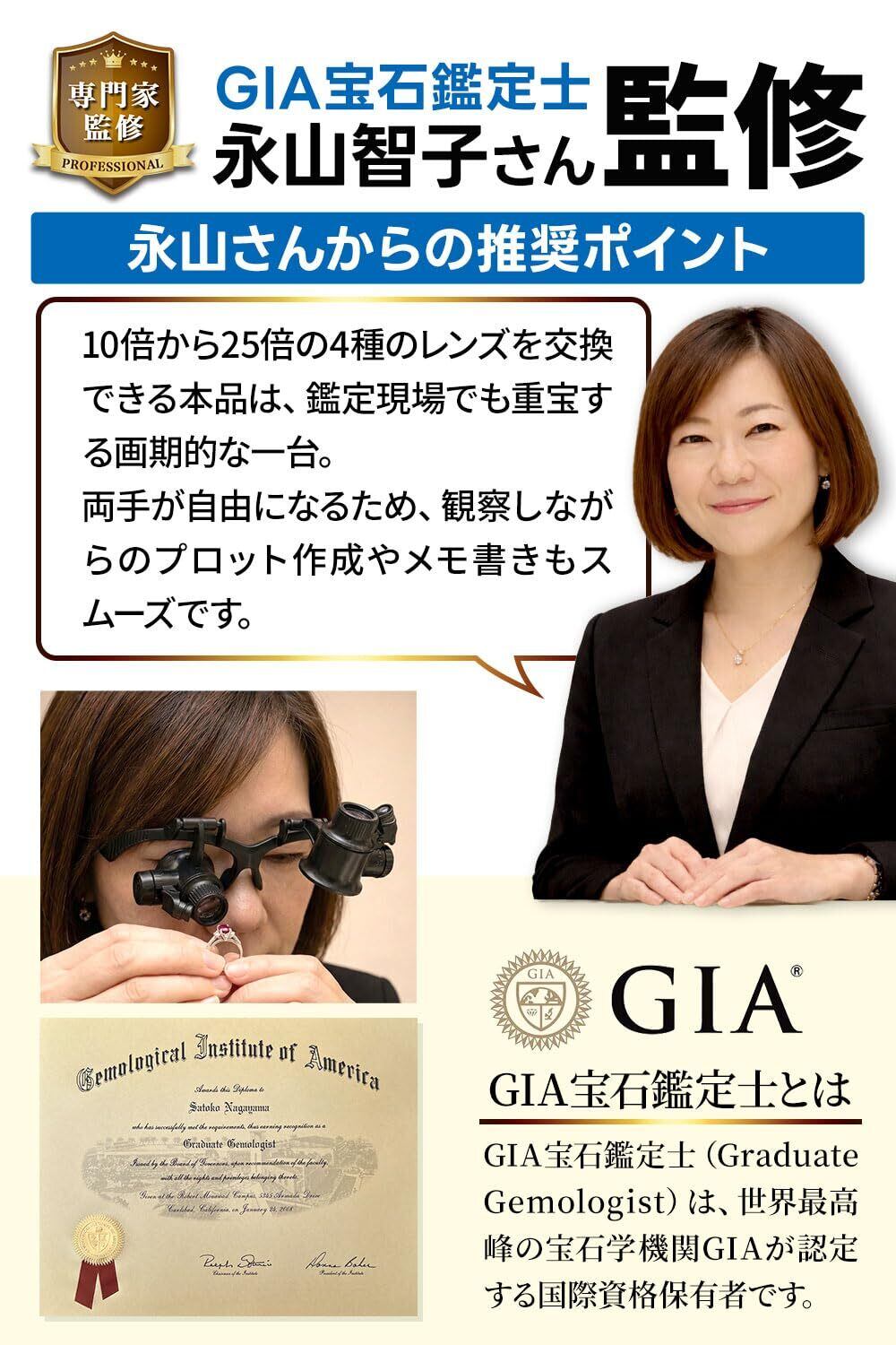 【GIA宝石鑑定士監修】宝石鑑定士が実際の鑑定現場で「重宝する」と評価する、10倍〜25倍の4種交換レンズ搭載・高照度LED内蔵のメガネ型ルーペ。両手が自由になる設計により、観察しながらのプロット作成やメモ書きもスムーズに行え、左右で異なる倍率を装着できる実用性と軽量ボディが長時間作業を快適にサポート。だからこそ、宝石の微細な内包物確認から精密検品・細密作業まで、プロ基準の視認性と効率性を実現する“本当に使える”一台です。