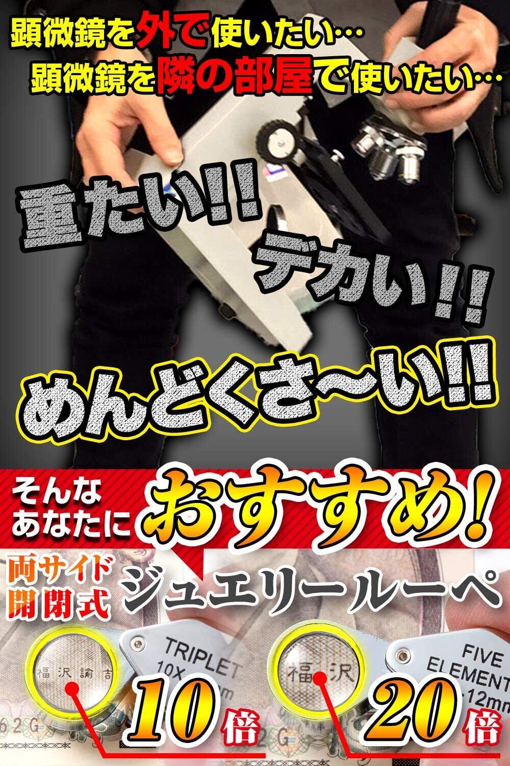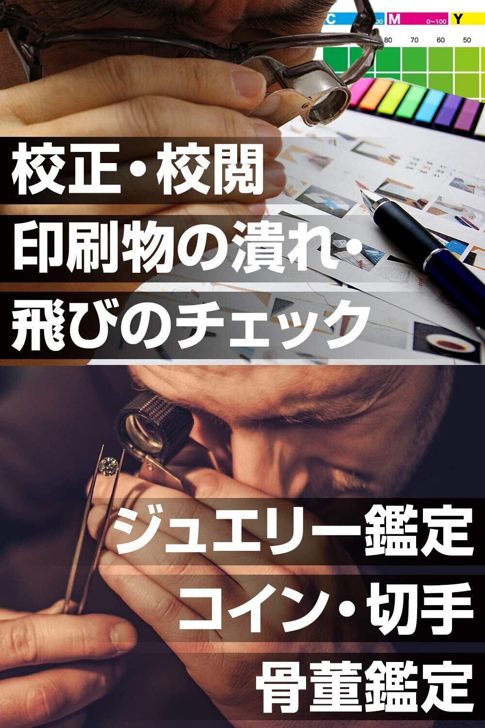 【10倍・20倍の2種類レンズ】折り畳み式携帯用ルーペ拡大鏡です。2枚レンズで倍率20倍、倍率10倍の高倍率!ジュエリー鑑定、コイン、切手、印刷物の校正、校閲などにオススメです。細かい作業などクッキリ・クリアに見えます!
