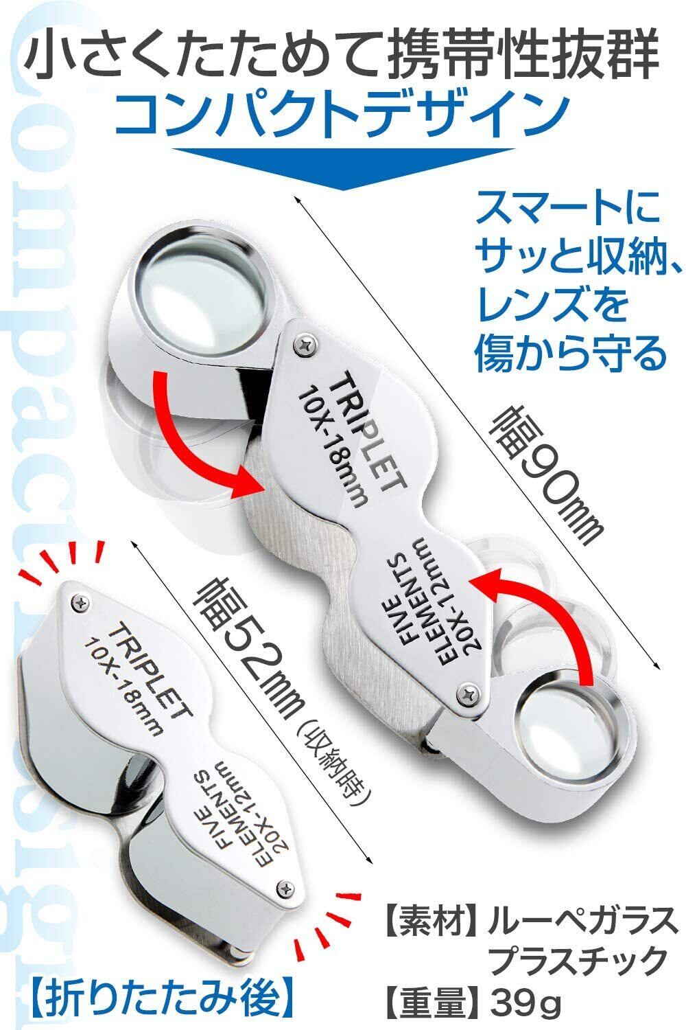 【サイズ】全長:90mm 収納時全長:52mm 重量:39g 素材:ルーペガラス、プラスチック 【付属品】45日間書 ルーぺ用ケース