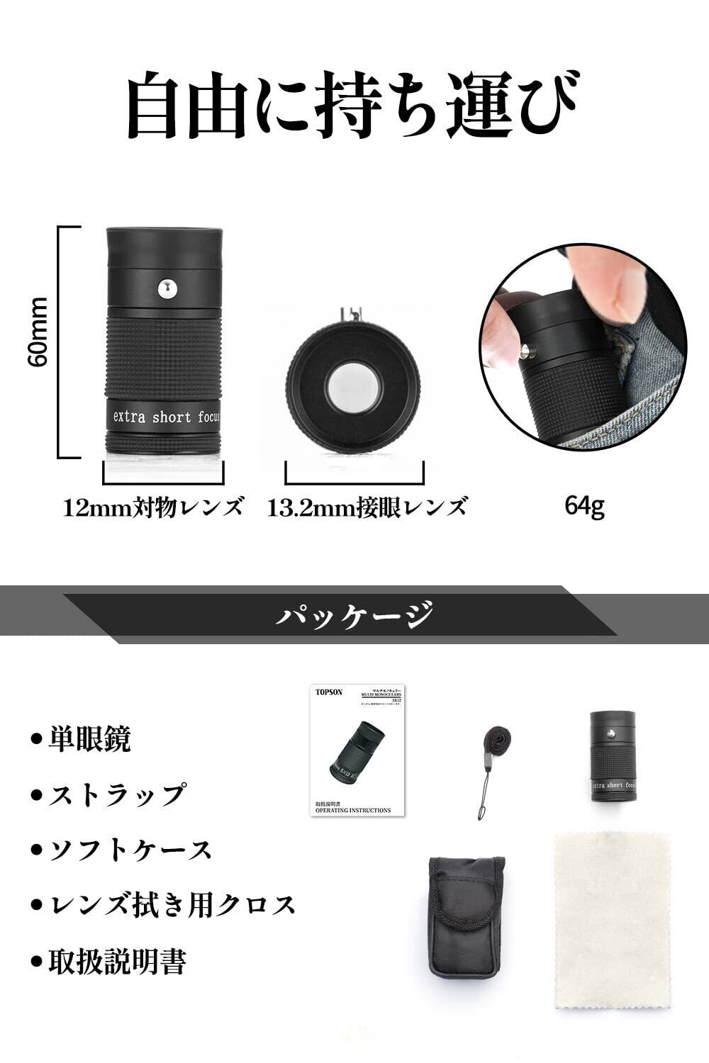 【持ち運びが苦にならないポケットサイズ】手のひらにすっぽり収まる手のひらサイズで重さも僅か64gなので、ポケットやバッグに入れても邪魔になりません。付属のネックストラップから首からぶら下げても気にならない軽さです。また、柔らかい手触りの収納ケースはもちろん、大切なレンズを保護しているので安心して保管頂けます。