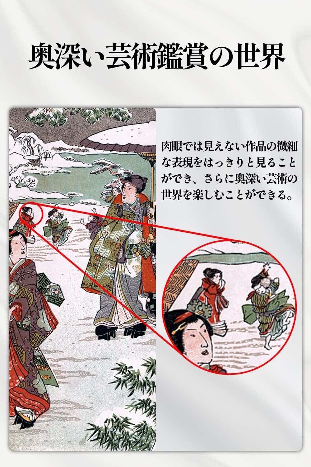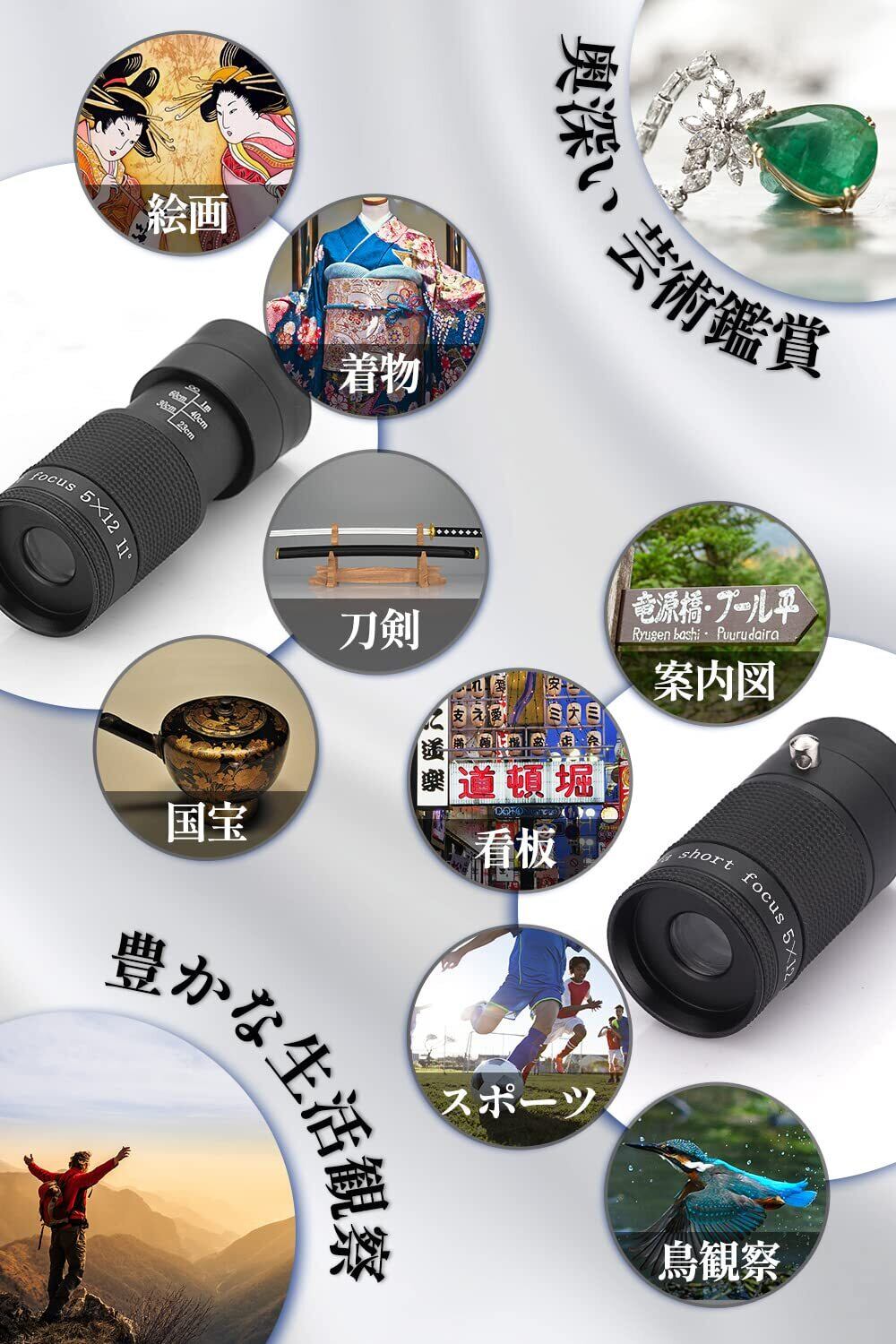 【幅広いシーンで大活躍】手ブレを起こしにくい小型単眼鏡はメガネをかけるでも対応できて、楽に目標物を見える!特に美術館で美術鑑賞をすすめです。 【細部を観察するには】着物、刀剣、絵画、国宝、宝飾品、浮世画、日本画、彫刻、屏風、洋画など楽しみ方に最適です。【拡大を観察するには】案内図、看板、スポーツ、鳥観察、動物観察、風景、黒板など楽しみ方に最適です。お年寄りに最高のプレイスです。
