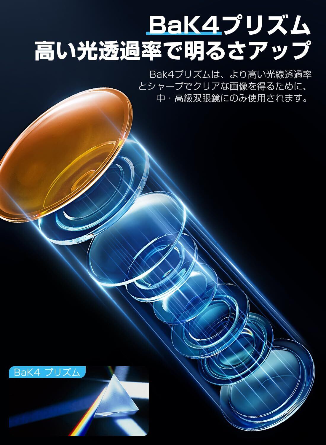 【高度なBaK4プリズム】高度なBaK4プリズムとFMC多層膜コーティングを採用し、光学性能を大幅に向上させます。 光の損失を減らし、クリアで明るく、比較的広い視野を確保します。