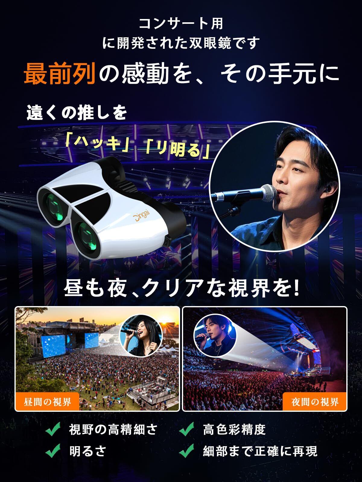 【 高倍率20倍·広視野75度 】双眼鏡 ライブ用は20倍のズームを備えており、ドーム、アリーナ、スタジアムなどの大規模な会場での使用に最適です!高倍率ズームと75度の超広視野により、遠くの座席からでもステージ上の表情を鮮明かつ広範囲に見ることができ、ライブパフォーマンスの臨場感を一層高めます。また、オペラグラスとしても使用可能で、お気に入りのアイドルのイベントにも最適です。