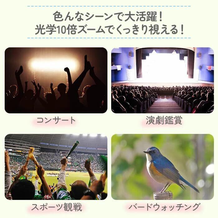【20倍高倍率&広視野設計】20倍の高倍率ズームで遠くの被写体を鮮明に拡大。コンサート・スポーツ観戦・野鳥観察などで、アーティストの表情や選手の動きまでクリアに確認できます。25mm対物レンズにより広い視野を確保し、まるで最前列にいるような臨場感を体感できます。