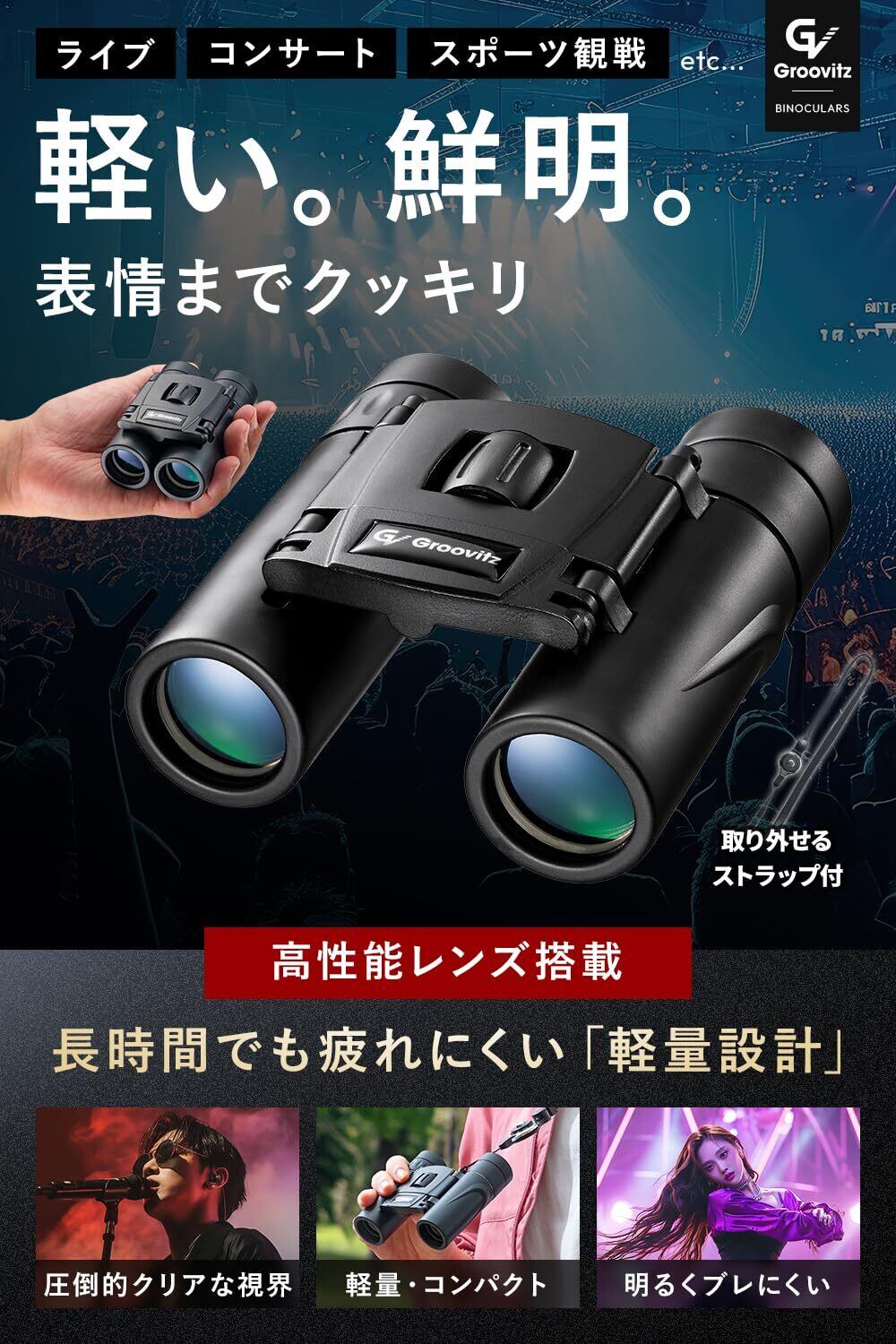 【ライブ・観劇にちょうどいい倍率8倍】ライブや観劇に最適な8倍ズームを採用。広い視野でステージ全体を見渡せるうえ、手ブレも少なく、初心者でも扱いやすい仕様です。ドーム、劇場、スタジアムなど、席を問わず推しや選手の姿を鮮明に楽しめます。