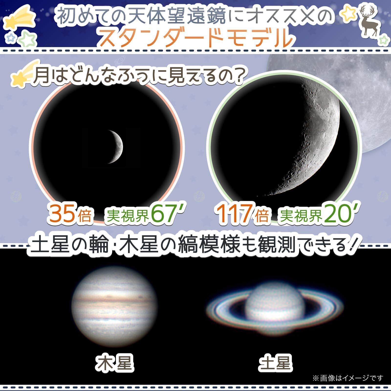 月のクレーター、木星の衛星、土星の輪など幅広い観測に便利な屈折式の天体望遠鏡です。
