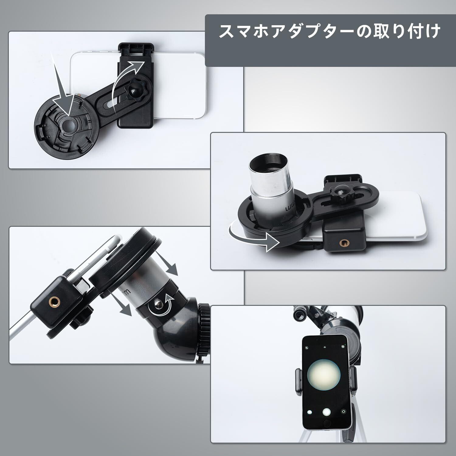 携帯性と便利性:スマホアダプターと調整可能なアルミ製三脚が付属。ワイヤレスリモコンとキャリングケースで、旅行やアウトドアでも便利です。