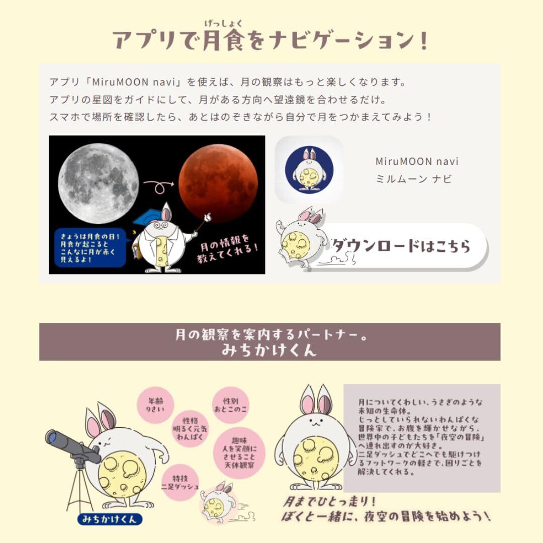 【ウサギのような案内人がエスコート。 お月見ナビアプリ】 スマートフォンなどのデバイスで使えるミルムーン専用アプリをご用意しています。 アプリを開くと、かわいらしいウサギのような案内人が登場。今夜の月が見える位置までご案内します。 アプリの星図をガイドにして、月がある方向へ望遠鏡を合わせるだけ。 スマホで場所を確認したら、あとはのぞきながら自分で月をつかまえてみよう! 満月、三日月、上弦の月……。日ごとに変わる月の表情や、「いまが見ごろ!」というタイミングも、案内人が楽しく教えてくれます。