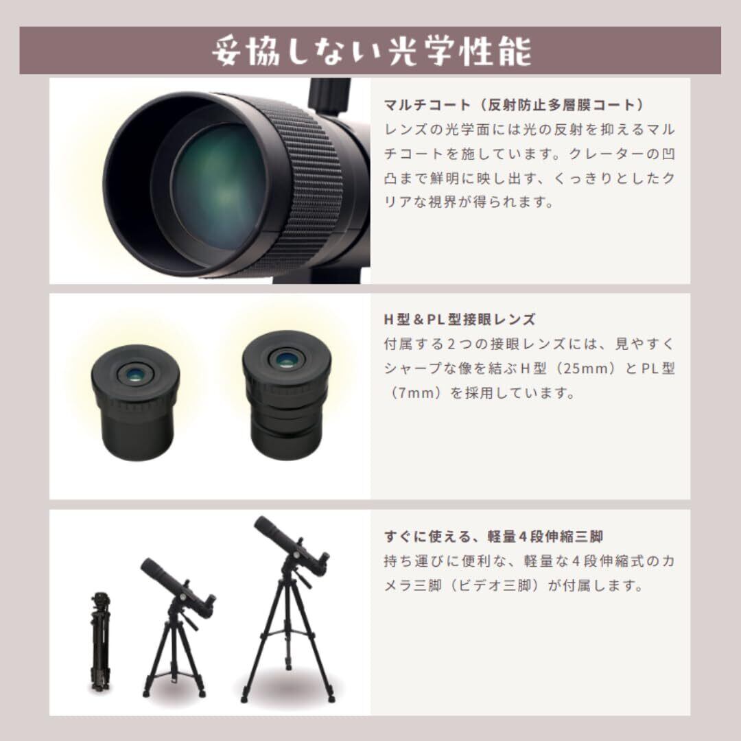 【妥協しない光学性能】 ■ マルチコーティング(反射防止多層膜コート) レンズの光学面には光の反射を抑えるマルチコートを施しています。クレーターの凹凸まで鮮明に映し出す、コントラストの高いクリア な視界が得られます。 ■ H型&PL型接眼レンズ 付属する2つの接眼レンズには、見やすくシャープな像を結ぶH型(25mm)とPL型(7mm)を採用しています。