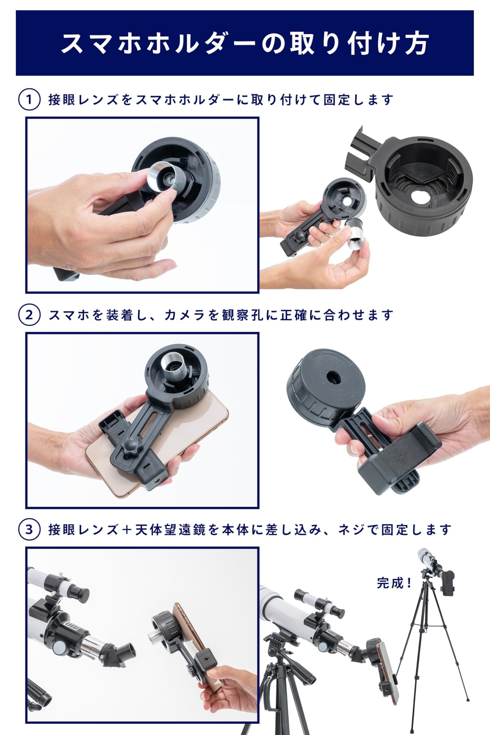 【初心者でも迷わない!簡単セットアップ】 複雑な工具や専門知識は一切不要。お子様や初心者の方でも、図解入りの日本語取扱説明書を見ながら数分で組み立て可能です。架台は直感的に動かせる経緯台式を採用しており、見たい星の方角へスムーズにレンズを向けられます。