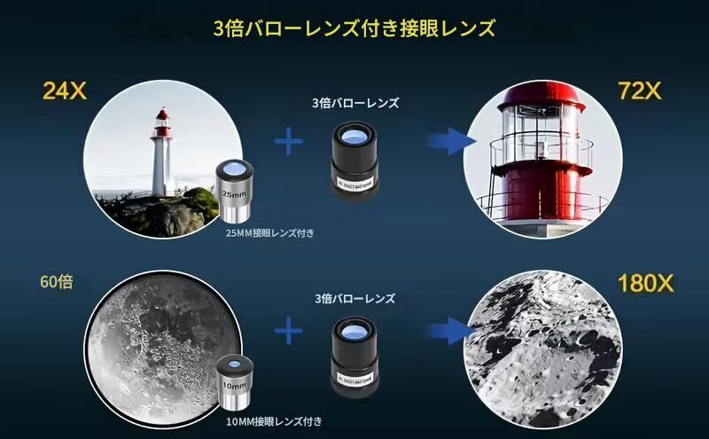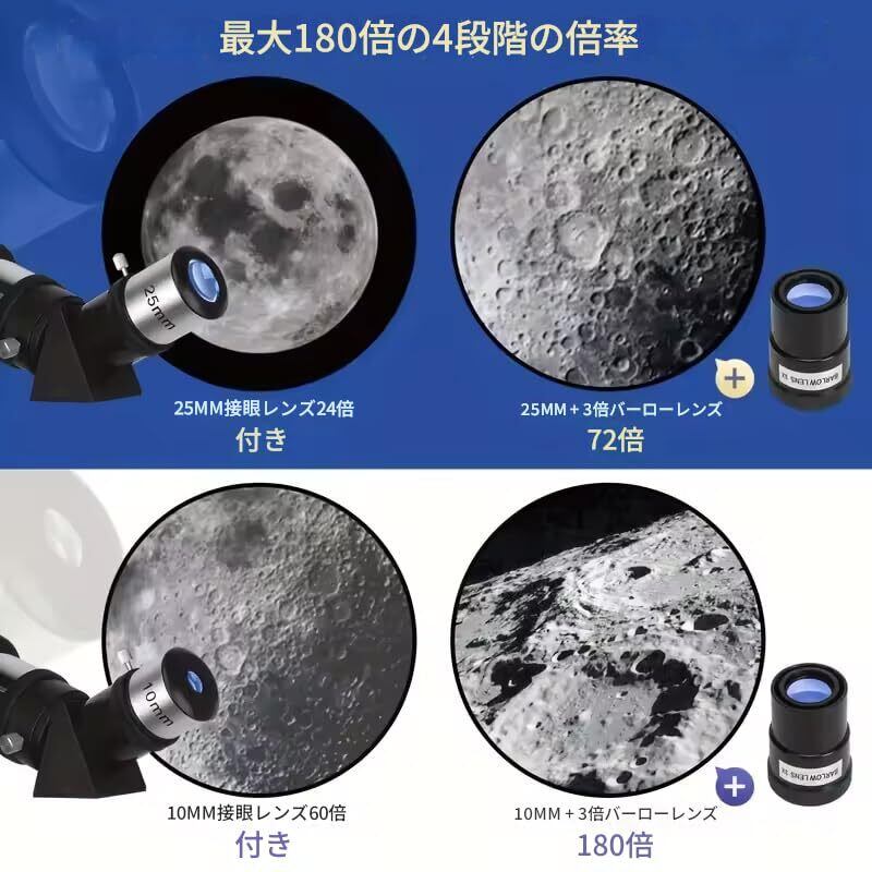 2つの高品質接眼レンズ(25mmと10mm)と3倍バローレンズが、異なる倍率を提供します。最大倍率は180倍で、月、惑星、そして近隣の銀河を鮮明に観察できます。付属の携帯電話アダプターを使えば、携帯電話を望遠鏡に接続して遠くの景色の写真や動画を撮影し、共有できます。また、この望遠鏡で自然や動物を観察することもできます。天体観測を始めるのに必要なものがすべて揃っています。