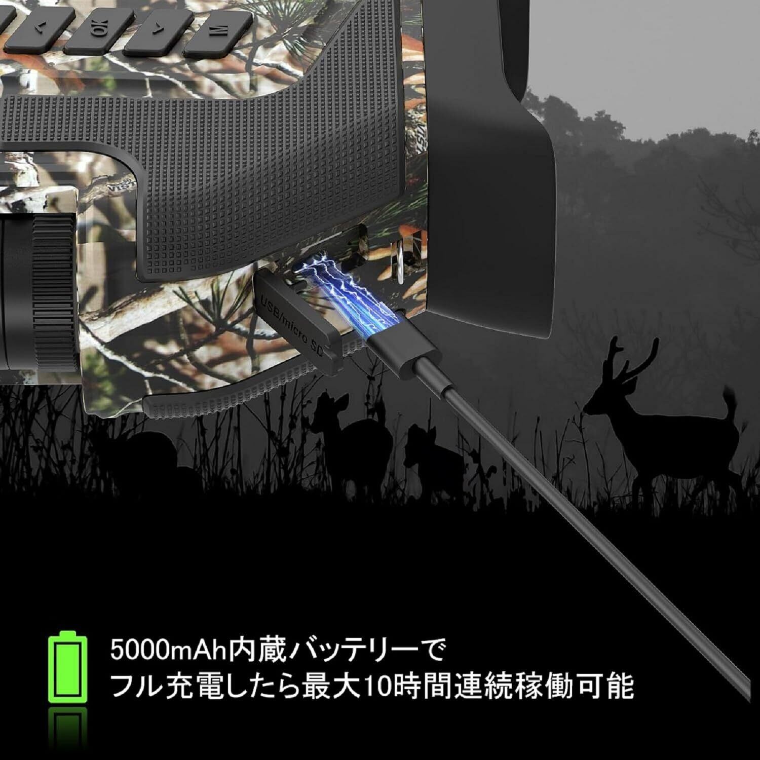 充電式暗視スコープ:3.7 V 5000mAh の内蔵バッテリーと 1.2メートル USBーC充電ケーブルを搭載しており、1回の充電で暗闇の中で白黒画像とビデオを10 時間以上撮影できます。 日中稼働時間15時間以上。