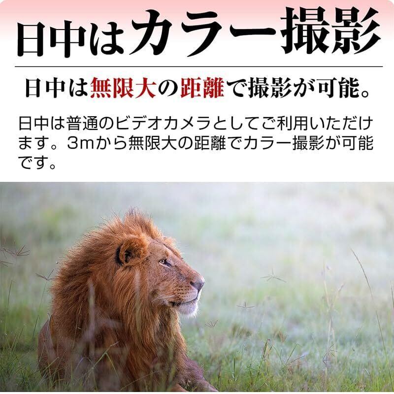 ●真っ暗闇でも赤外線可視:3W/850nmのIRLED搭載。真っ暗闇の中でも赤外線で可視化し、最大700mの距離内で、野生動物を肉眼で見ながら撮影します。 ●夜間でもカラー撮影:スターライトセンサーを採用。夜間でも街灯や月明りなどの光がある場所では、赤外線をオンにすることなく3mから無限大にカラー撮影します。 ●日中はカラー撮影:日中は普通のビデオカメラとしてご利用頂けます。