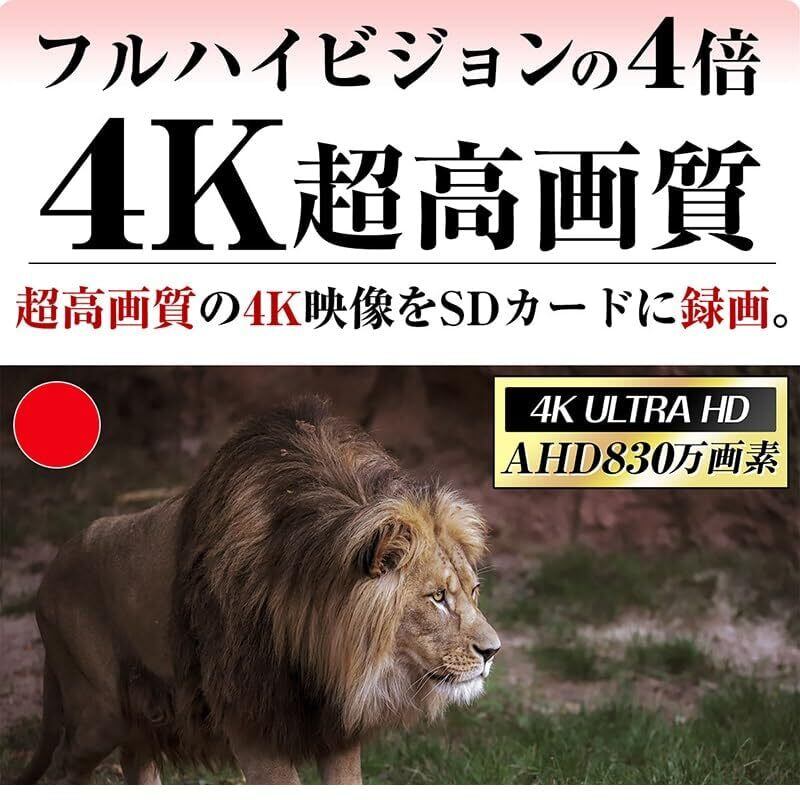 ●4K超高画質で録画:録画解像度は4K、1080FHD、1080P、720Pの4種類から選択可能です。 ●手ぶれ補正機能:デジタル処理で画像の揺れを抑える手ぶれ補正機能を搭載しました。撮影時の手ぶれを軽減・補正します。メニューからオフ、オンの切り替えが可能です。 ●静止画撮影:動画撮影だけでなく静止画の撮影も可能です。撮影解像度はなんと最大5800万画素です。 ●音声も録音:マイクとスピーカーを搭載し録画と同時に録音もおこないます。ビデオ再生時に音声の確認も可能です。