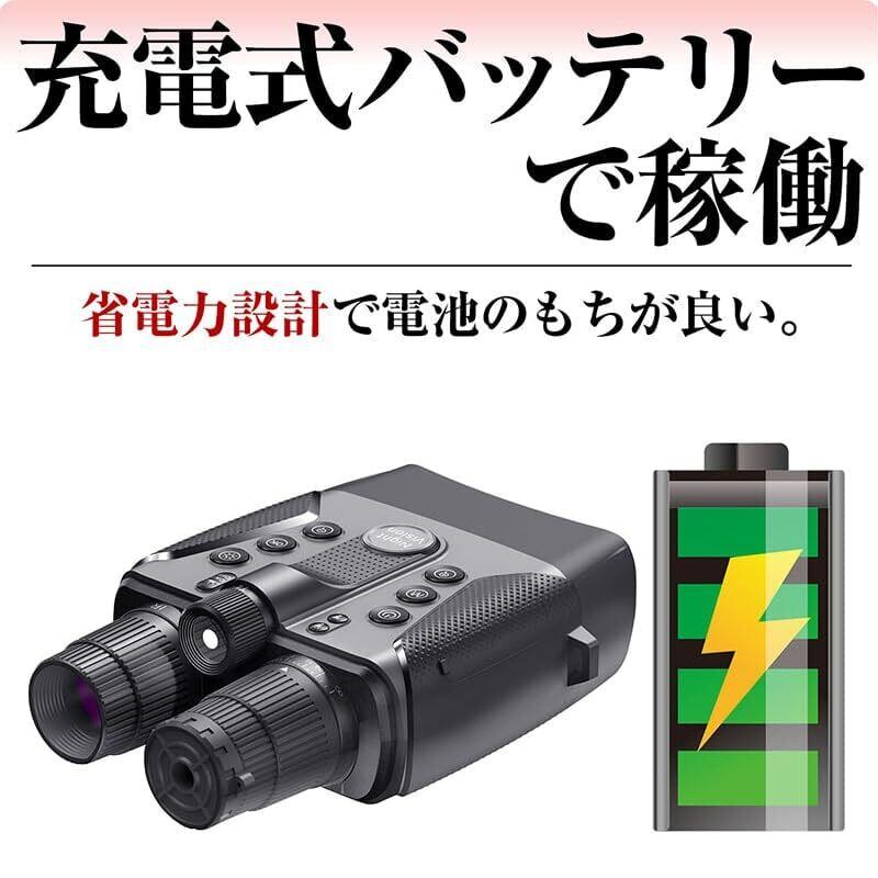 ●望遠もできる双眼鏡:5倍デジタルズーム機能を搭載。ズームインしたり、より広い視野にズームアウトしたりできます。 25mm/5倍レンズを搭載し、トータル25倍の望遠を実現しています。 ●マニュアルフォーカス:マニュアルフォーカスレンズを採用。レンズ部が360°回転しますので、ディスプレイを見ながら手動でピントを合わせることが出来ます。 ●UVカットフィルター:強い日差しやUV(紫外線)が多い環境では、フィルターキャップを取り付けるだけで、UVカットフィルターが紫外線を遮断します。これにより、コントラストを高め、かすみを軽減し、シャープさが向上し、色合いが改善されます。 ●4.0インチ液晶ディスプレイ:ファインダーには4.0インチの液晶ディスプレイを採用しています。このクラスの暗視双眼カメラのなかでは最大のファインダーディスプレイです。
