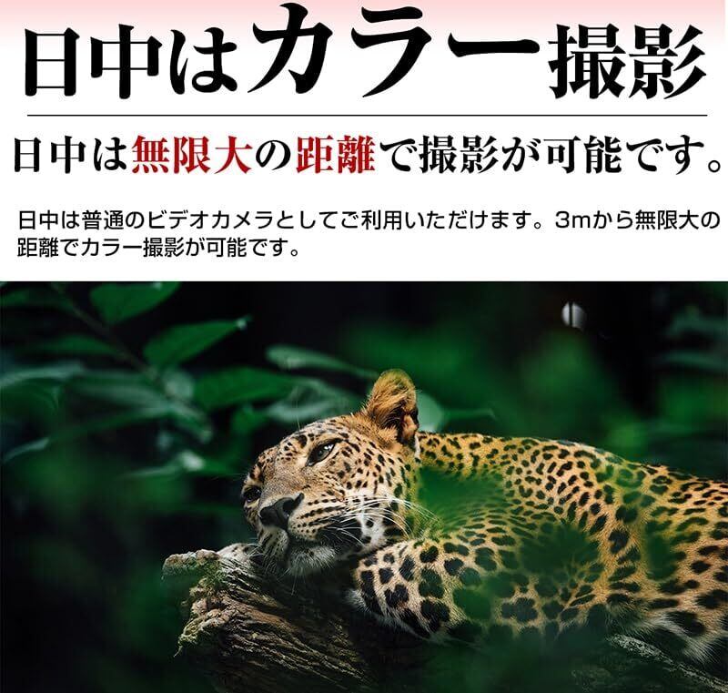 ●真っ暗闇でも500mを暗視・5W/850nmの赤外線LEDを採用。真っ暗闇のなかでも500mの距離を、野生動物などを肉眼で見ながら、暗視撮影ができる双眼鏡タイプの暗視ナイトスコープカメラです。・赤外線レベルは7段階調整式、ご利用される暗さの環境に合わせて、段階を調整して利用することが可能です。●夜間でも無限距離でカラー撮影・スターライトセンサーを採用。夜間でも街灯や月明りなどの光がある場所では、赤外線をオンにすることなく3mから無限大にカラー撮影が可能です。・映像の明るさと距離については、光の量や環境により大きく変わります。