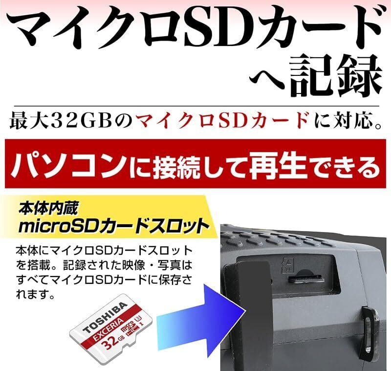 ●単三乾電池で稼働・単三乾電池8本で稼働します。省電力設計ですので電池の消費量が少なく、長時間の利用が可能です。本体の蓋を開けて乾電池を入れるだけです。また乾電池が取り出しやすい紐付きです。・※商品には乾電池は付属しておりません。別途お買い上げが必要です。●三脚にも設置できる・国際規格の1/4インチのネジ径スクリューホールを装備。市販の三脚と一緒に使えば、カメラを手に持たなくても、どこかに置いて動画撮影することも可能です。【付属品】カメラ本体/32GB microSDカード/ネックストラップ/キャリングバッグ/USBケーブル/クロス/日本語マニュアル
