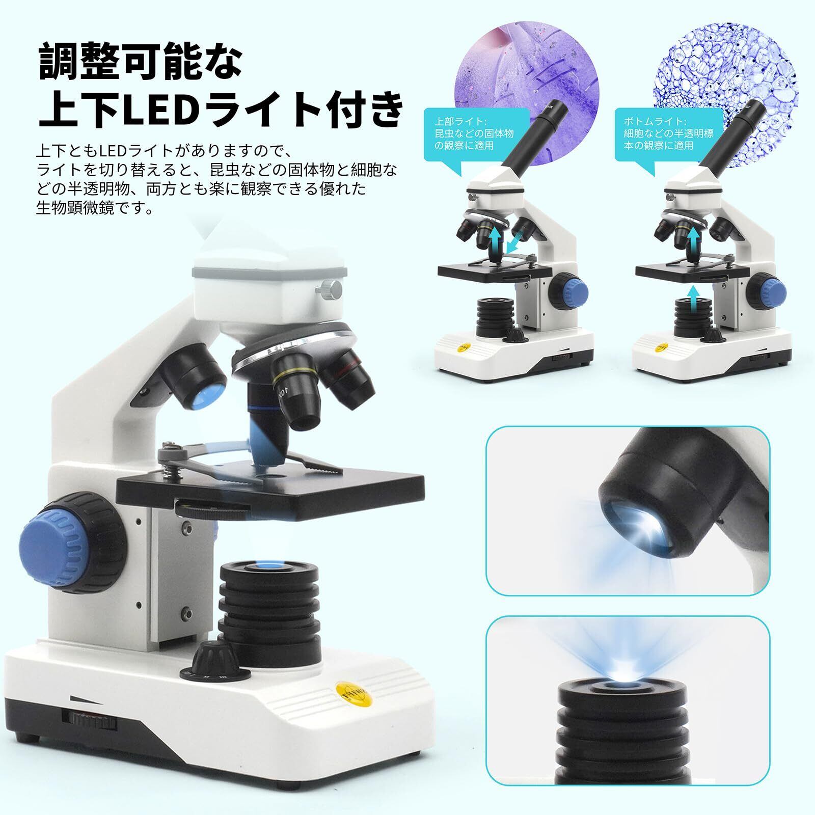 [調整可能な上下LEDライト付き顕微鏡] 子供や学生にとって完璧なSTEMプレゼント!このセットは従来のセットと比べて、より豊富なアクセサリーが付属しており、今からでもミクロの世界を探検しましょう!上下ともLEDライトがありますので、ライトを切り替えると、昆虫などの固体物と細胞などの半透明物、両方とも楽に観察できる優れた生物顕微鏡です。