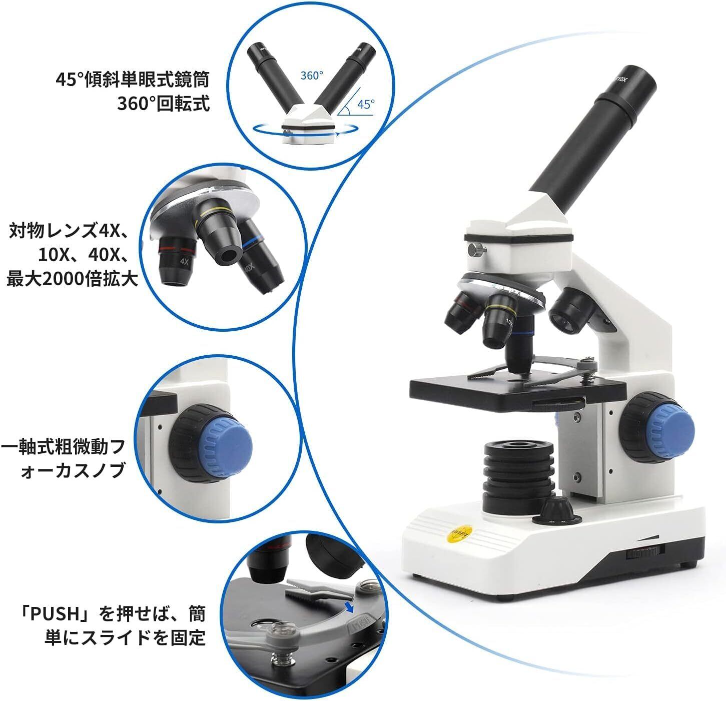 [80X-2000X広視野、高倍率 顕微鏡 小学生] 高性能のアクロマート対物レンズ4X、10X、40X(S)を搭載されることにより、鮮明でシャープな画像が見えます。2Xの補足レンズもありますので、2000Xまで拡大可能です。