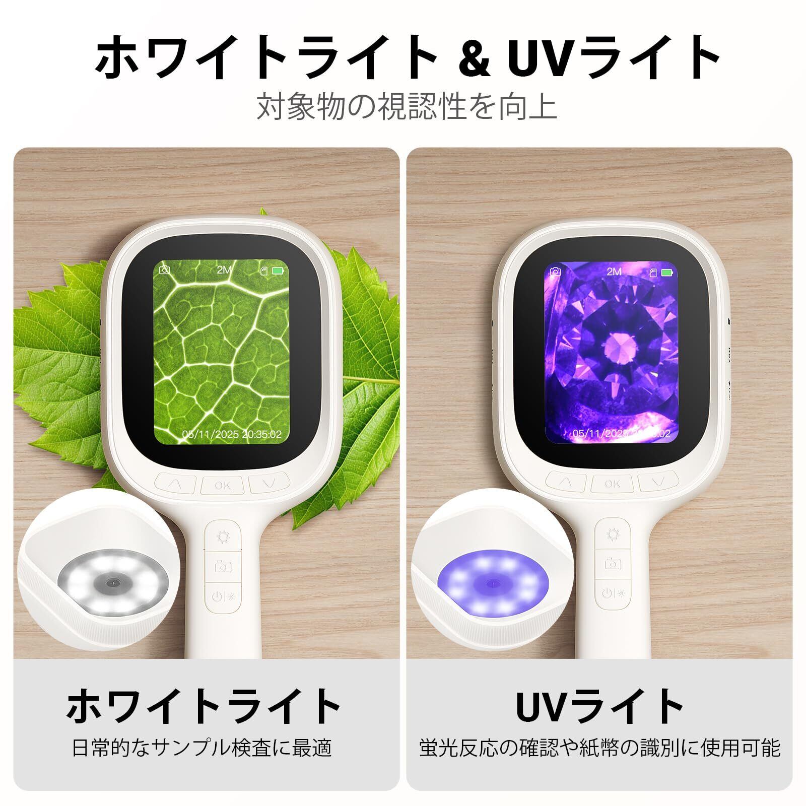 【電子顕微鏡はLEDライト8灯+UVライト8灯搭載】明るさ調整可能なLEDライト8灯を搭載し、暗所でも観察しやすい設計。さらにUVライト8灯を搭載し、蛍光反応の確認や宝石・素材観察などの用途にもご使用いただけます。