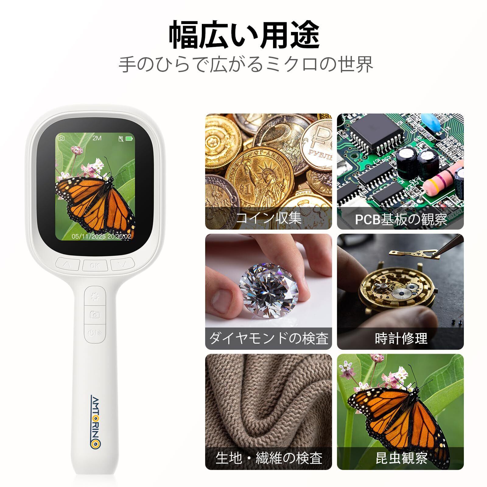【幅広い用途に対応/1000mAh充電式】1000mAhバッテリー内蔵で、約2時間45分使用可能(使用環境により異なります)。宝石観察、古物確認、昆虫観察、基板チェック、時計メンテナンス、自然観察など多用途に活用できます。日本語を含む8言語対応で設定も簡単です。