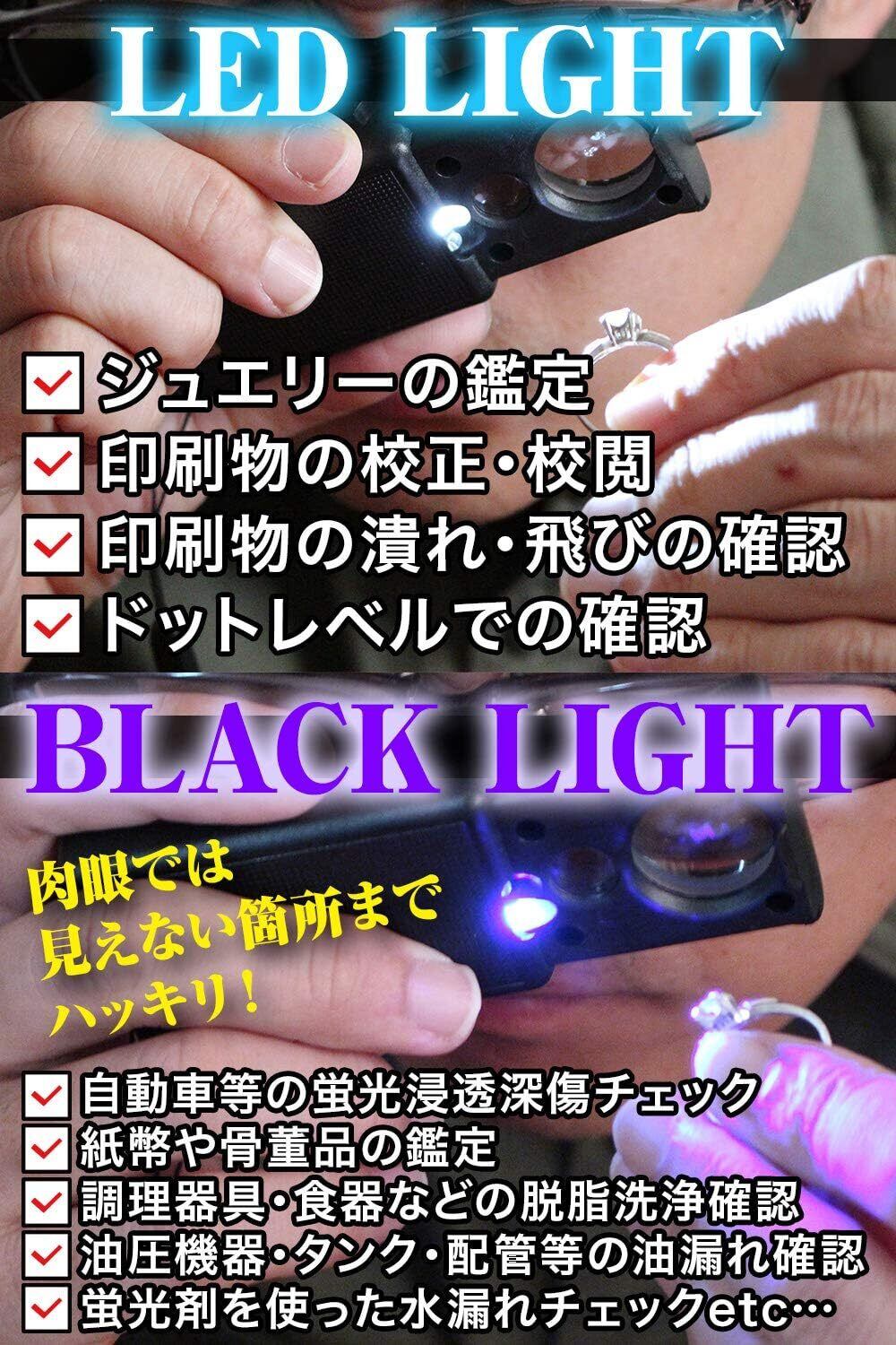 【精密作業に大活躍】様々な精密作業や日常生活、動植物の観察に大活躍!例えば指に刺さって痛いトゲ抜きからジュエリー鑑定、印刷物の校正、校閲、潰れ・飛びの確認など印刷物のドットレベルまで見えるルーペです!ブラックライトを使用すると右記のような使用が可能です。自動車等の蛍光浸透深傷、蛍光磁粉深傷、紙幣や骨董品の鑑定、外食産業・調理器具・食器などの脱脂洗浄確認、油圧機器・タンク・配管等の油漏れチェック、蛍光剤を使った水漏れチェックetc・・・肉眼では見えない箇所までハッキリと見えて作業もはかどります!