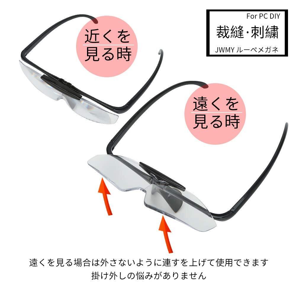 ルーペメガネを使ってこまかい作業をしたり読書をしている途中でちょっと休憩、そんな時にもワンタッチ! 片手でレンズを跳ね上げて使用できます。 ルーペメガネつけたり外したりする煩わしさがなく効率がアップ!