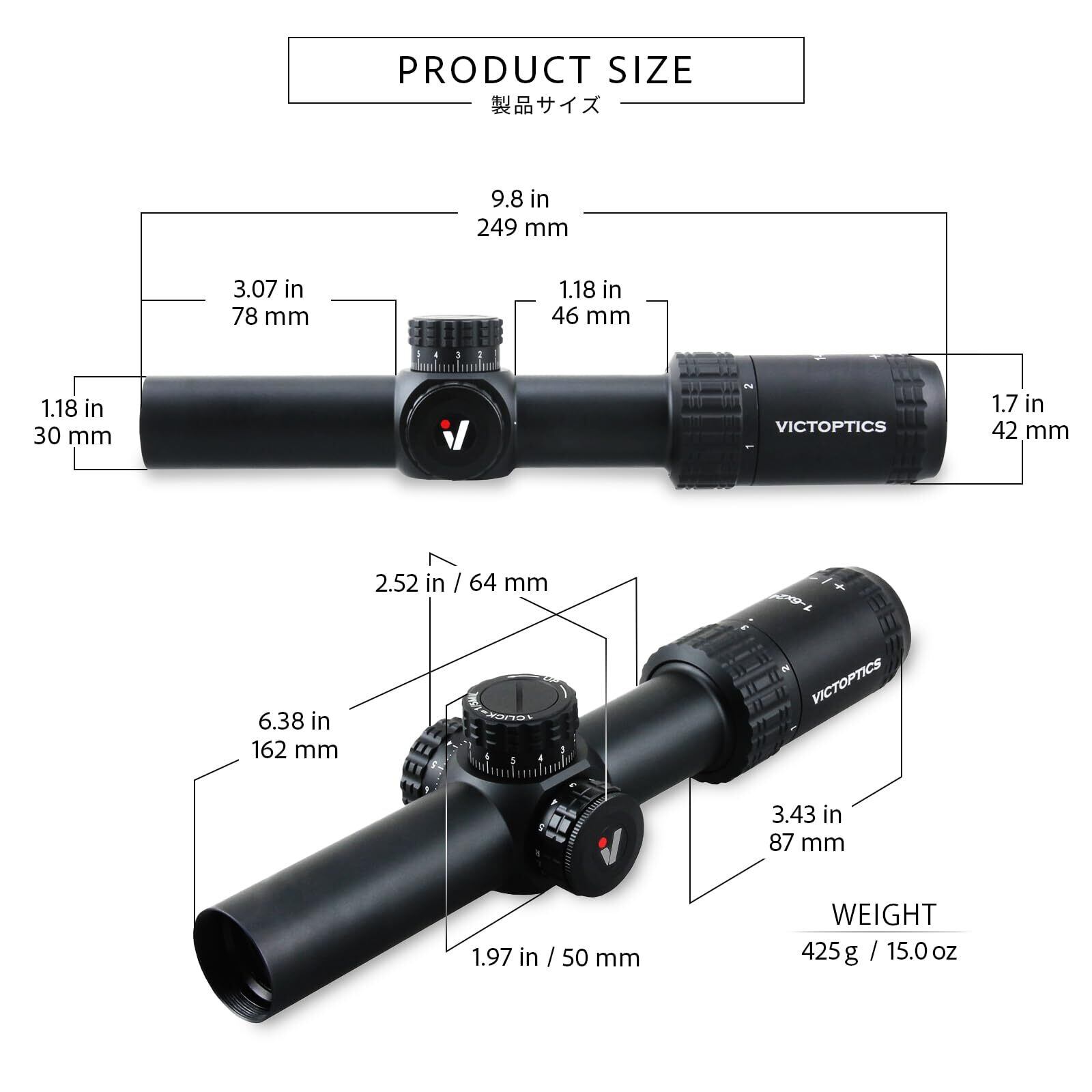【製品詳細】倍率 1−6× 対物レンズ径 24mm 全長 249mm 重量 425g アイリリーフ 101mm チューブ径 30mm クリック 1クリック=1/2MOA レティクル MIL 赤・緑イルミ CR2032(別売)。
