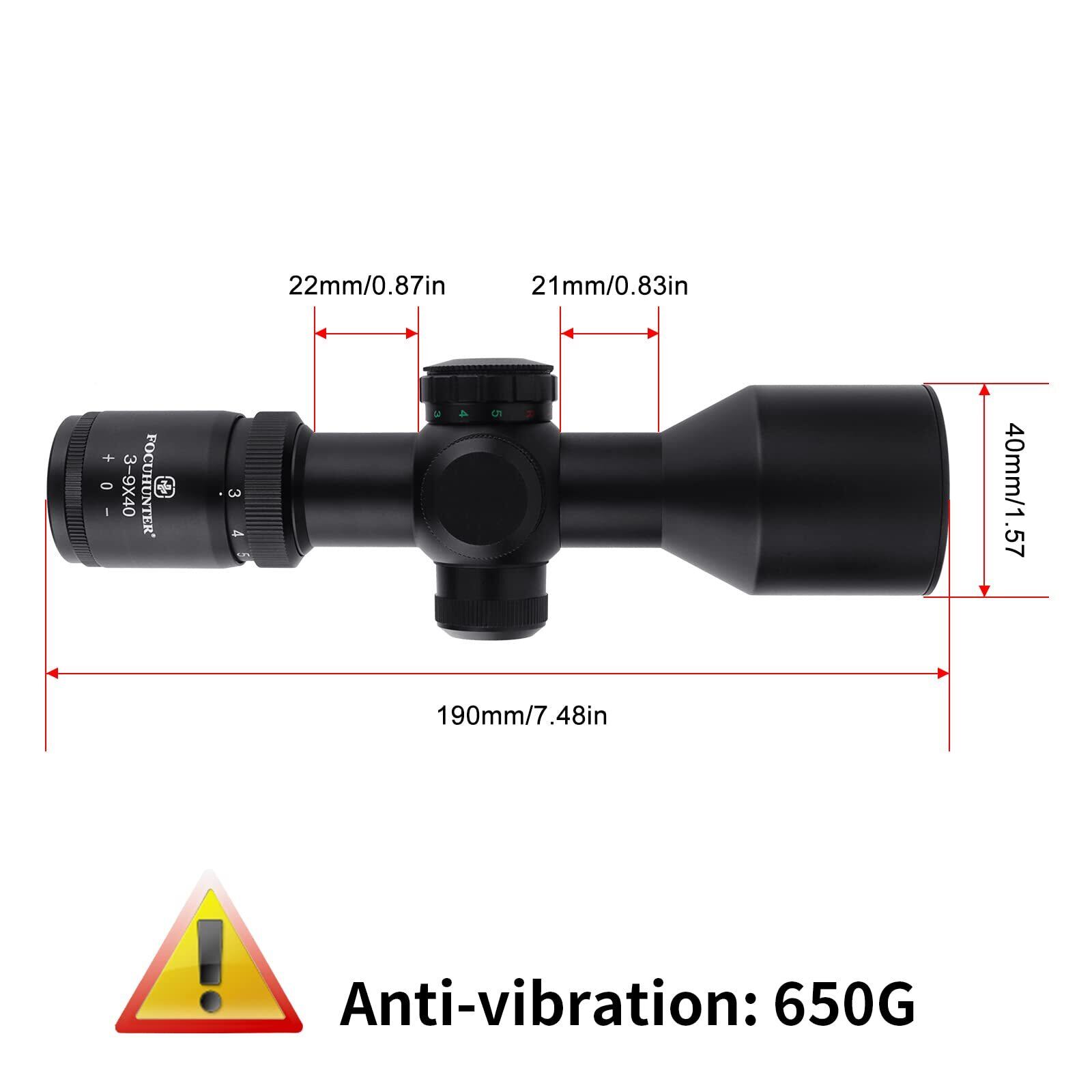 プロなオプティクス:コンパクトスコープの倍率は3-9倍(可変倍率)、対物レンズの直径は40mm、アイレリーフは58.4mm-68.6mm、100ヤードで1クリック1/4"です。このスコープの長さはわずか190 mm(7.5")で、持ち運びに便利で、操作が簡単です。 アウトドアスポーツ活動に活躍しています。