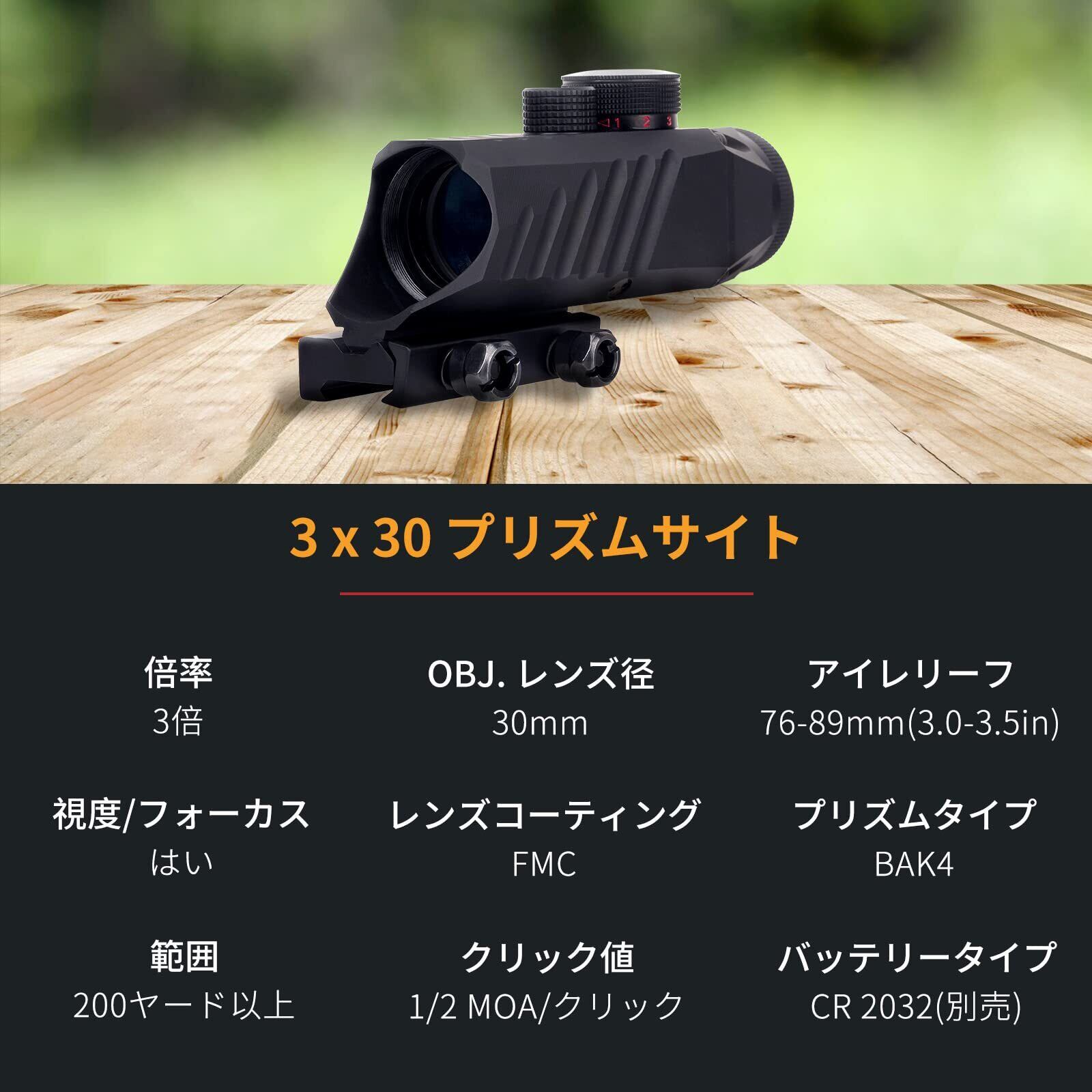 FOCUHUNTER プリズムスコープ 3X30 タクティカルサイトスコープ 赤緑照明付き 光学スコープ 1000G'sリコイル耐衝撃 3MOAドットサイズ 1/2MOAクリック値 20mmレール用の標準ピカティニーウィーバーマウント付き