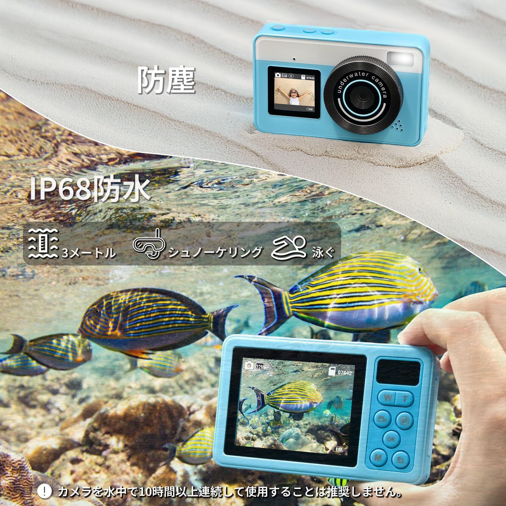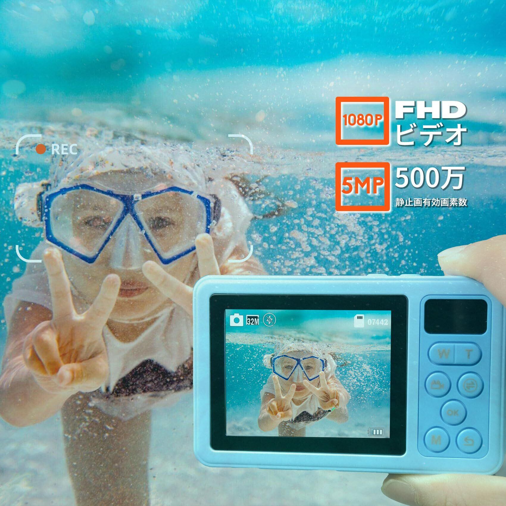防水カメラ 1080P 自撮可能 デジカメ 動画&写真 3M防水 ケース不要 水中カメラ 操作簡単 フラッシュ撮影をサポート 軽量 コンパクト 32GB Micro SDカード付属 バッテリー付き (ブルー)
