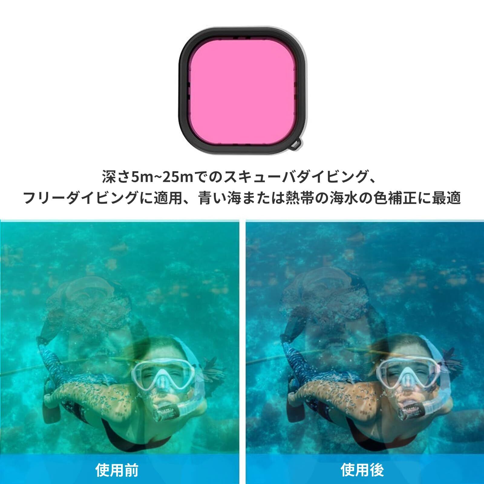【3パックダイブフィルター付属】TELESIN防水キットには、3パックダイブフィルター、レッドフィルター、ライトフィルター、マゼンタフィルターが付属しています。これらのフィルターは、主に5〜25メートル(16〜82フィート)の水中での色補正に使用されます。