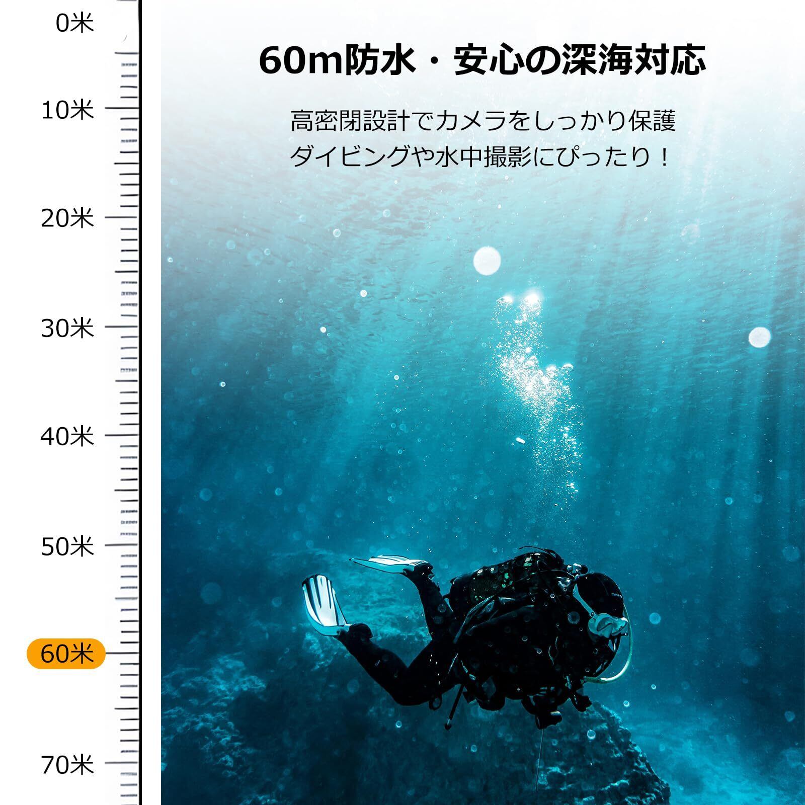 【防水ハウジング水深60m対応】この防水ハウジングは水漏れを効果的に防ぐ、アップグレードされた防水シールリングとタイトなロックカバー付き、水深60mまでの水中撮影に対応しており、深い海中でも明るく鮮明な映像を記録できます。レンズ部には透明度の高い強化ガラスを採用し、カメラレンズを保護しながら、ダイビング時に水中の高画質撮影をサポートします