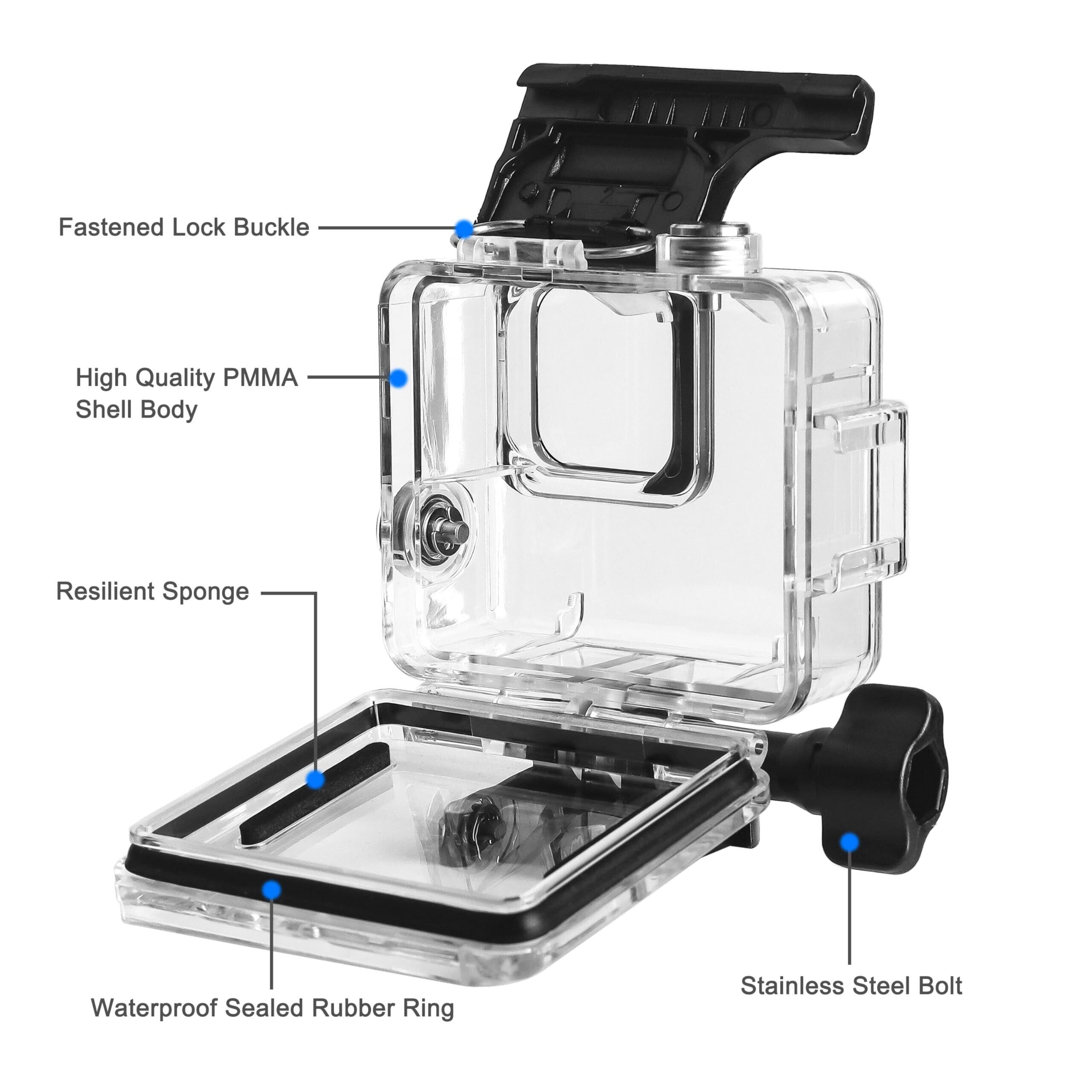【クイックインストール&手間いらずのセットアップ】かさばるケースとは異なり、このGo Pro Hero 4K用ダイビングハウジングは、取り付け前にレンズを取り外す必要はありません。カメラをケースに差し込むだけで、数秒で使えます。 人間工学に基づいたデザインにより、ボタンとポートへのフルアクセスを維持し、シームレスな操作をします。