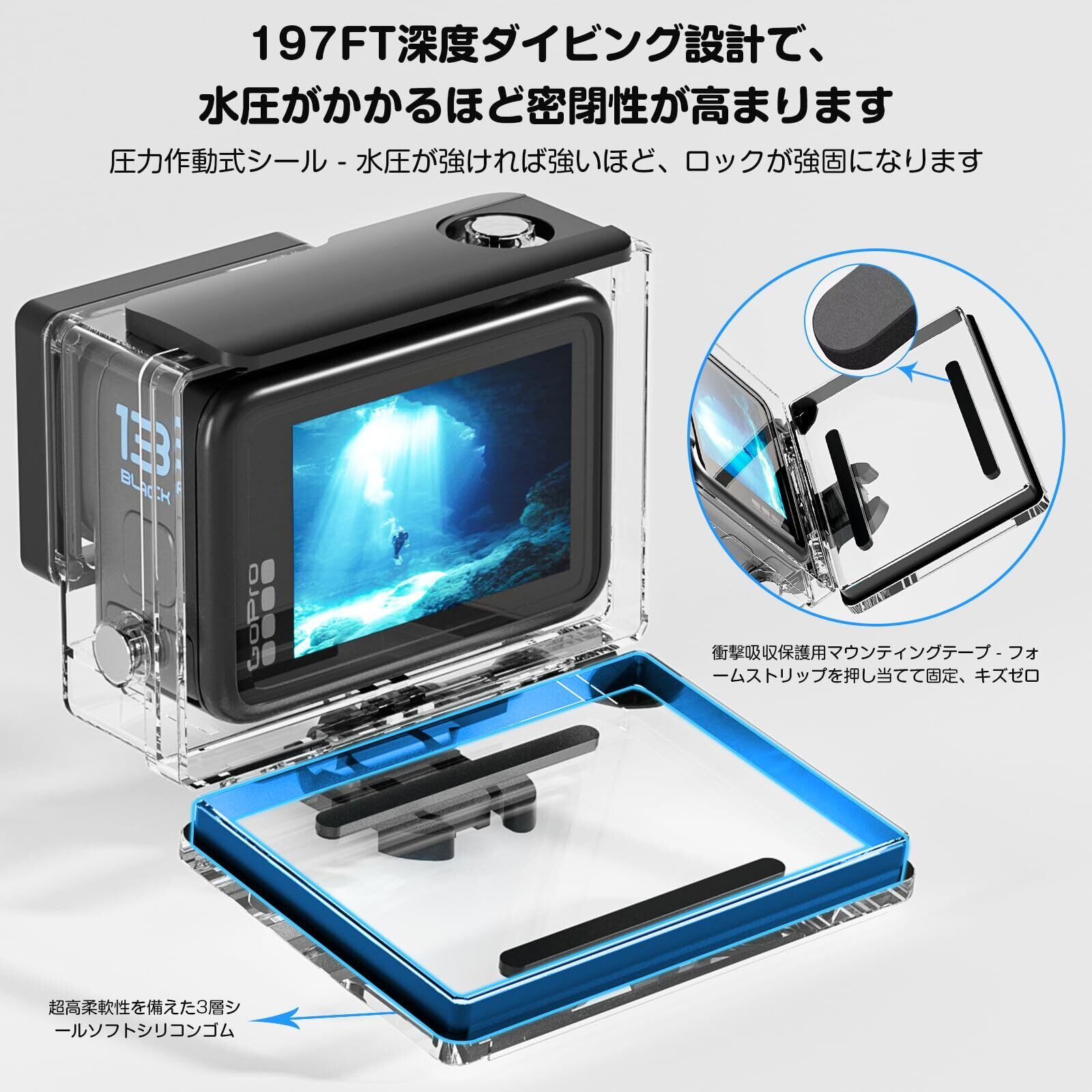 F1TP ハウジングケースは、Go Pro HERO 13/HERO 12/HERO 11/HERO 10/HERO 9 Blackに対応し、60mの水深でのダイビングや防水・防塵保護を提供します。