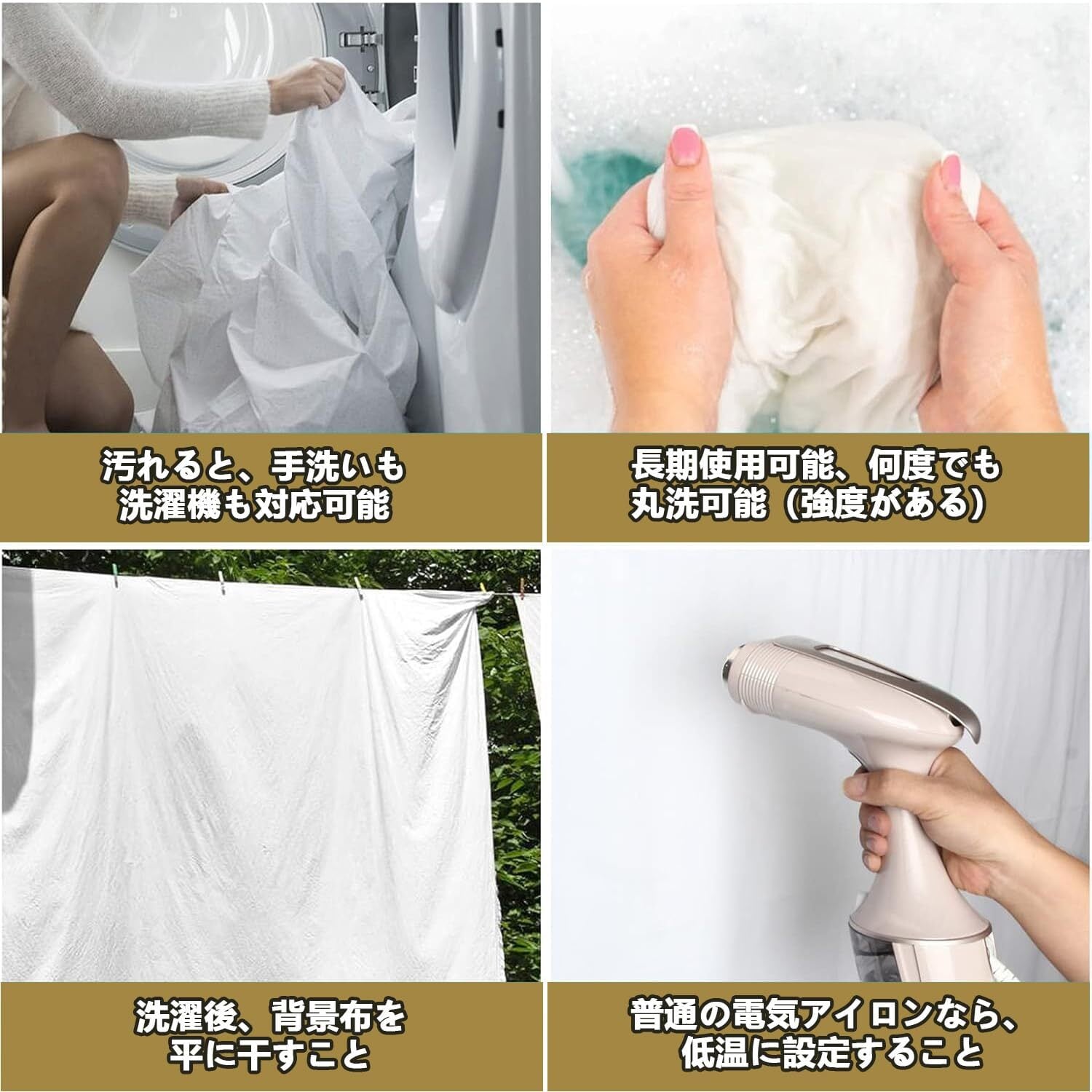 お手入れがカンタン:1.白布を手でも洗濯機でも洗えます。洗濯後、平らに干すことをお勧めいたします。もししわがあるとき、スチームアイロンをかけるとシワが取れます。2.電気アイロンを使うと、低温にご設定ください。それにずっと同じなところに当てらずに、動かしながらアイロンをしてください。もしスチームアイロンの場合、特に制限がなくて、最高温度で使用してもよろしいです。注:白背景布は濡れたままアイロンすると効果的にしわを伸ばすことができます。